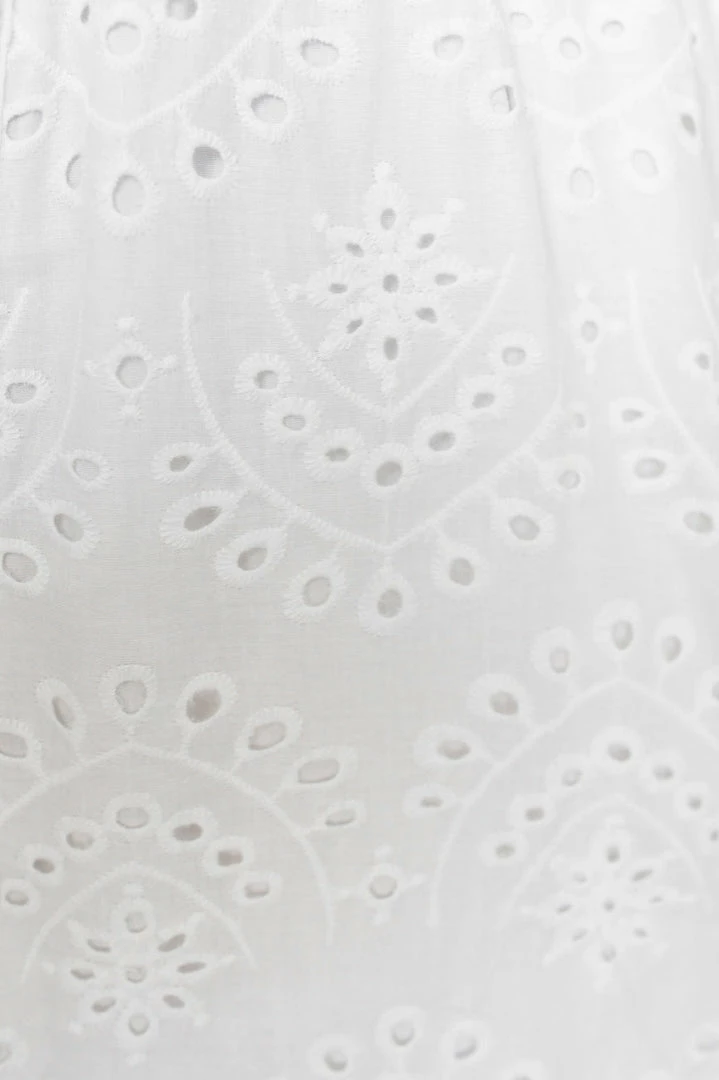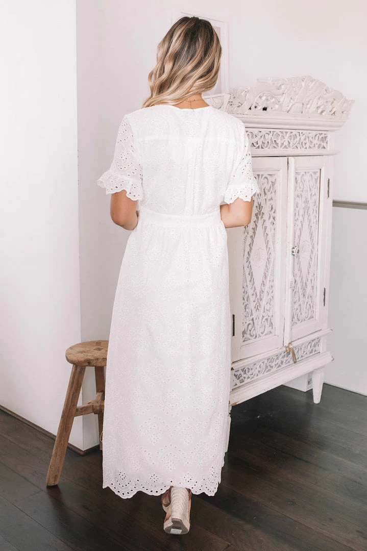 - Key Features: Broderie Anglaise fabrication. Short sleeves with frill detailing. V neckline and buttons on front. Midi-maxi length (dependent on height). Gathered bust and waist detailing. Relaxed skirt. Maternity friendly.