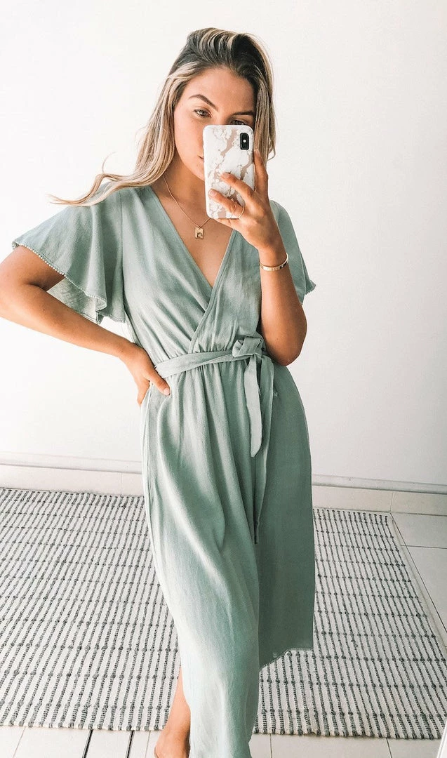Our Chatter Dress is a sage tone. It’s a gorgeous medium weight linen material in a relaxed and effortless fit perfect for hot summer days & baby bumps. This breathable midi features a v neckline making this ideal for breastfeeding. The short butterfly sleeves and waist tie cinch the figure beautifully making this a feminine and fun addition to the wardrobe.
