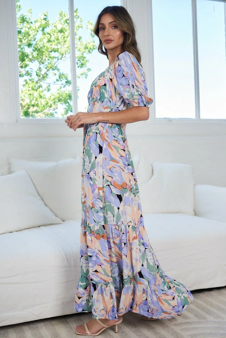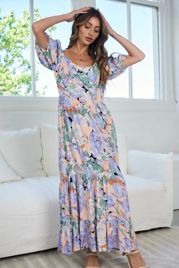 - Key Features: Maxi length. Relaxed fit. Sweetheart neckline. Short puff sleeves with elastic. Frill hemline. Maternity friendly.