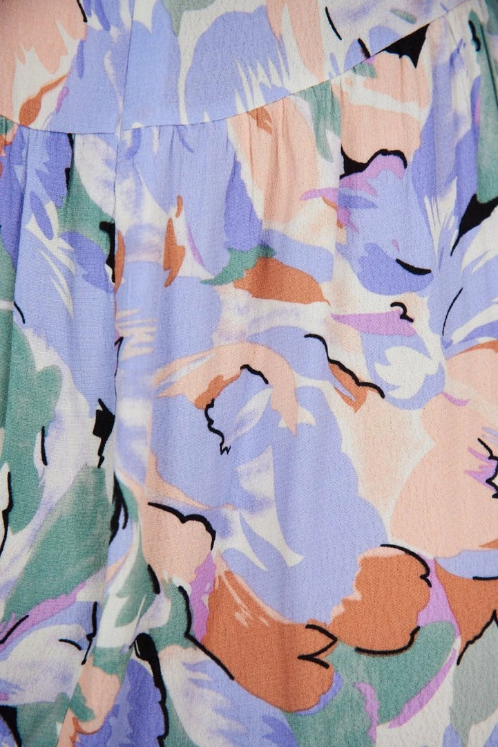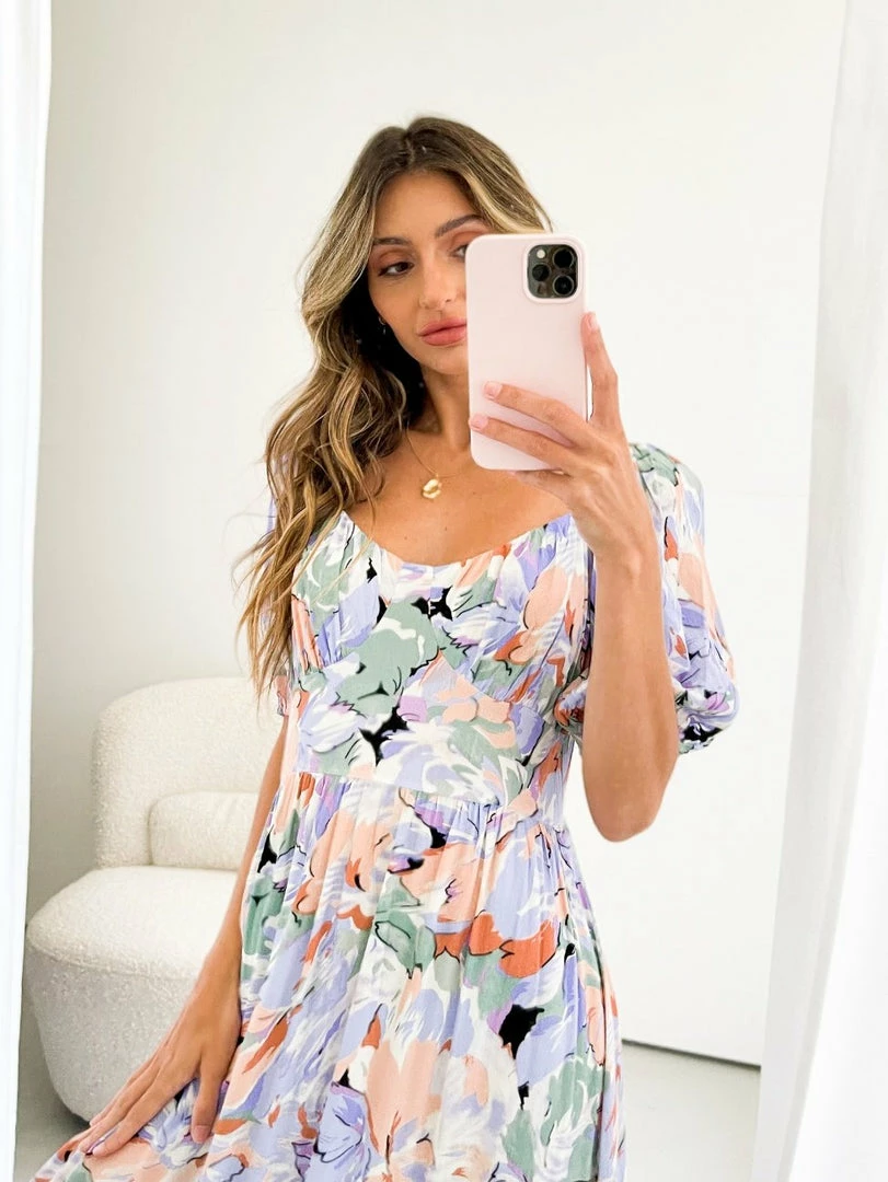 Our Uke Dress is a floral print dream featuring beautiful lilac, peach, white, green & mustard tones. This maxi is a relaxed fit featuring gorgeous puff sleeves that are elasticated for comfort. The frill hemline is the perfect dash of femininity to this number.