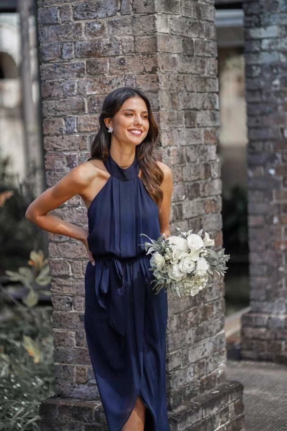- Key Features: Standard sizing. Slightly fitted style. Light weight fabric. Lined. Non stretch fabric. Elastic waist band. High neckline. Pleats in front of garment. Open back. Wrap style skirt.