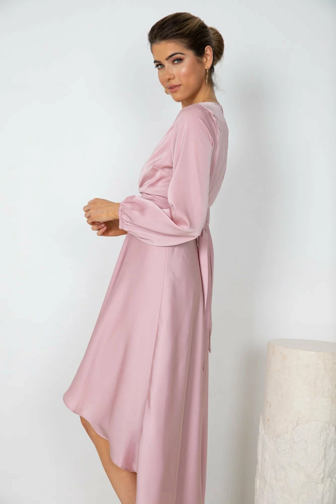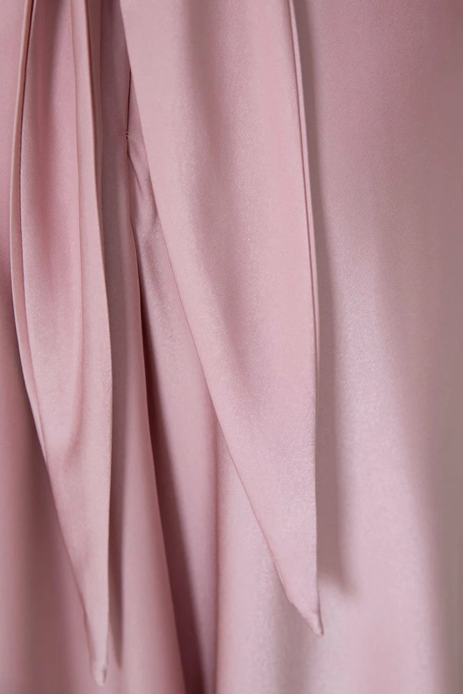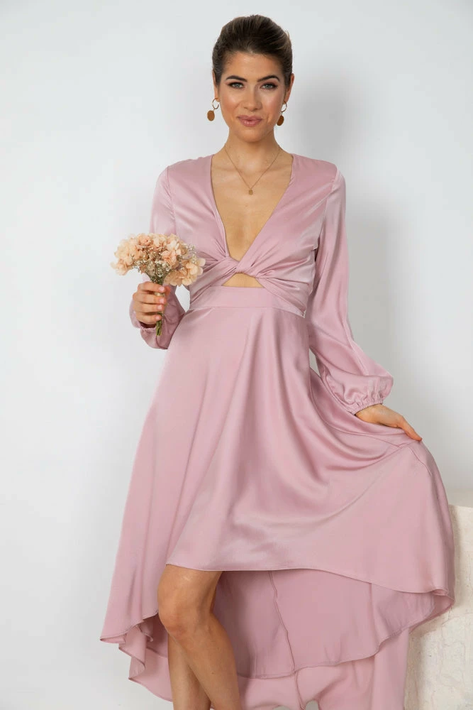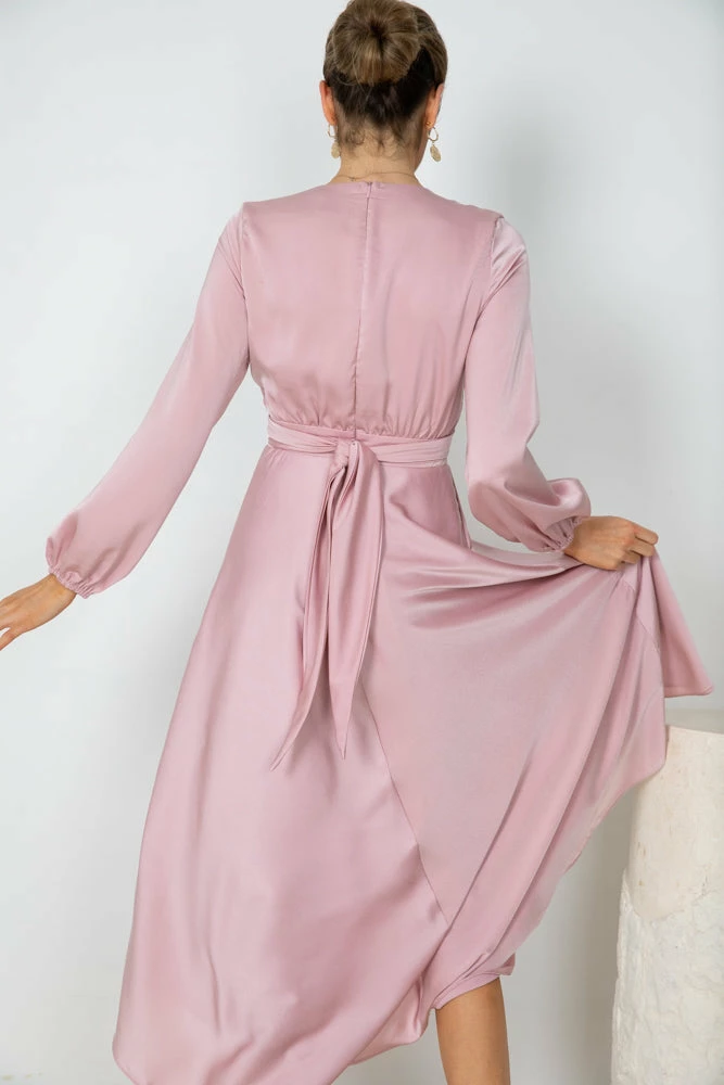 Our Bryleigh Dress comes in a pink blush tone. It features a v neckline and long bishop sleeves, coming together at the front with a fabric tie. This flowy midi pairs beautifully with heels for an effortless trans-seasonal look!