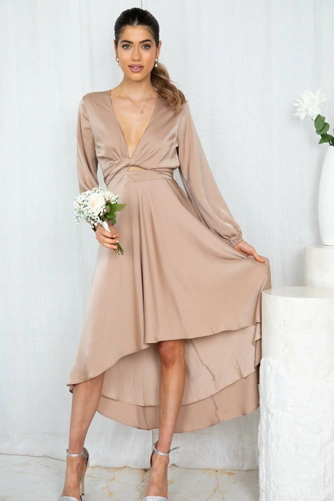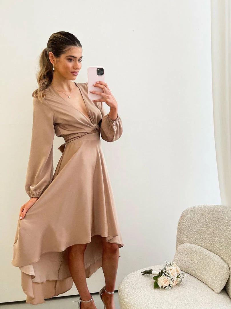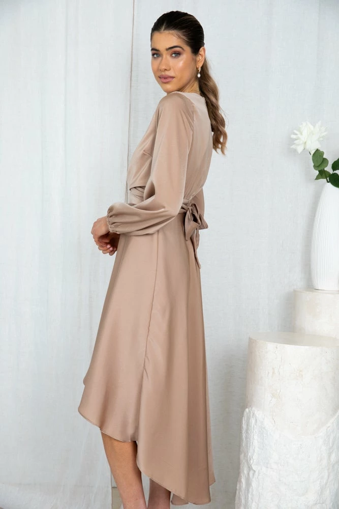 Our Bryleigh Dress comes in a mocha brown tone. It features a v neckline and long bishop sleeves, coming together at the front with a fabric tie. This flowy midi pairs beautifully with heels for an effortless transseasonal look!
