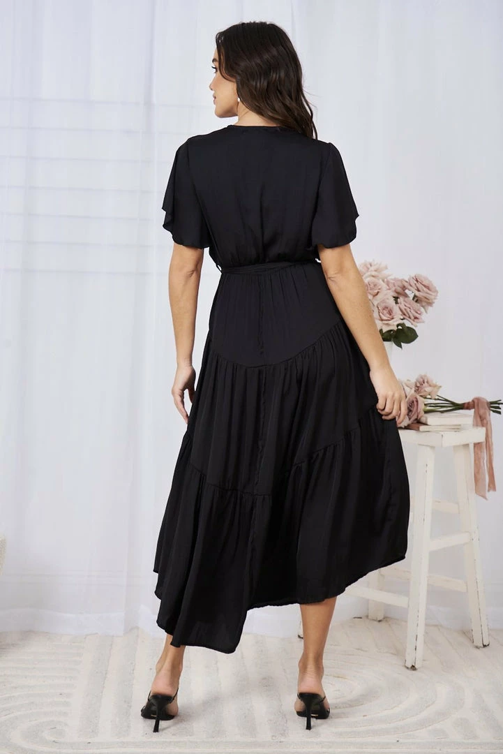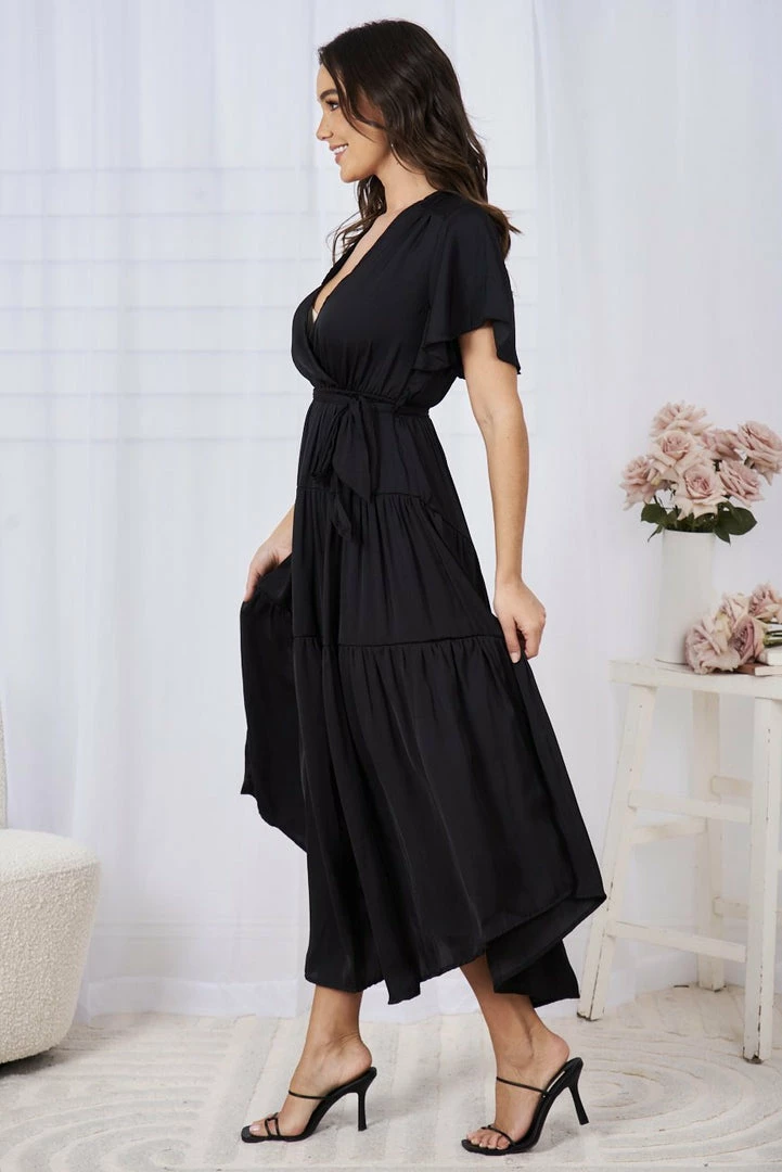Our Given Dress comes in a classic black tone. This relaxed fit midi features a layered high low hemline and wrap-like bust with an elastic waist and fabric waist tie to beautifully cinch in the figure. The butterfly short sleeves and relaxed fit make this ideal for maternity wear and provide ultimate comfort whilst looking your best.