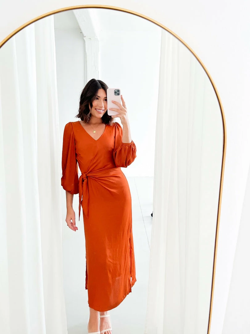Our Heather Dress is a dark terracotta with baked rose undertones. It’s a gorgeous lightweight material in a flattering & relaxed silhouette. The v neckline, bishop 3/4 sleeves & tie on waist detailing are feminine additions to this classy dress.
