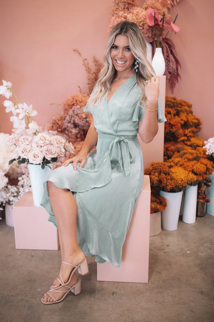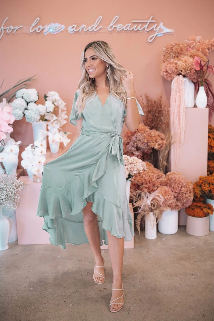 Our Farren Dress comes in a stunning sage tone in a relaxed fit. This wrap-look midi features a V neckline complemented by the asymmetrical hemline with tie detailing. The ruffle detailing on the sleeves and skirt hemline are gorgeous additions to this classy piece.