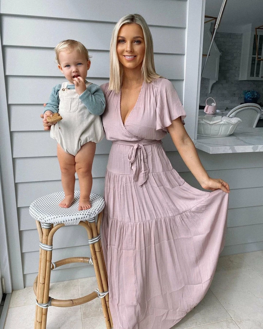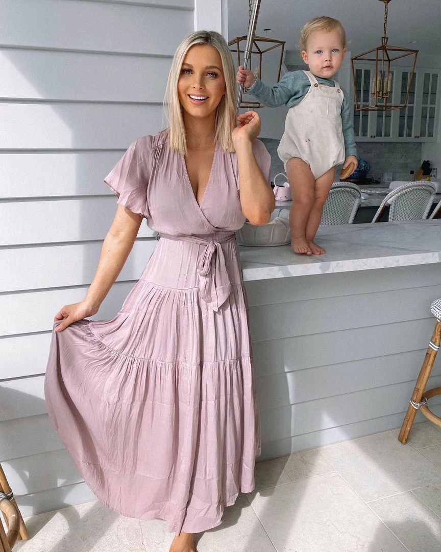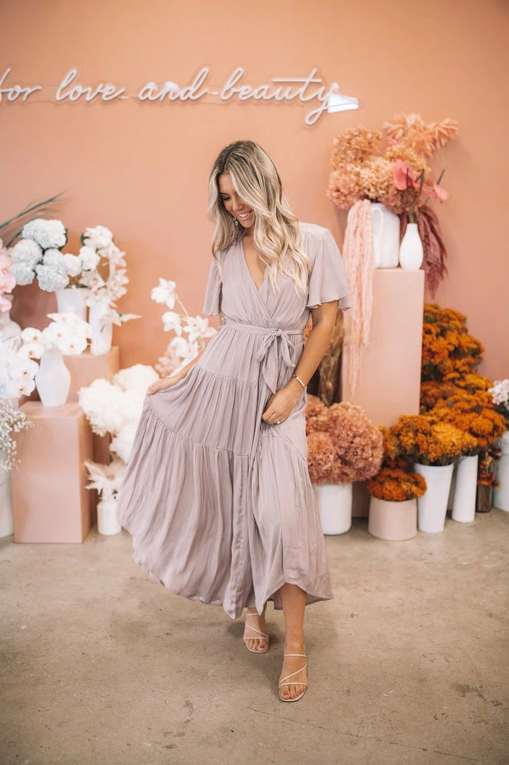 Our Given Dress comes in a stunning dusty pink tone. This relaxed fit midi features a layered high low hemline and wrap-like bust with an elastic waist and fabric waist tie to beautifully cinch in the figure. The butterfly short sleeves and relaxed fit make this ideal for maternity wear and provide ultimate comfort whilst looking your best.