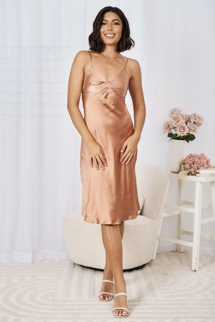 Our Keke Dress comes in an orange rust tone. This slinky midi features a V neckline, twist and cut out detailing on the bust, adjustable spaghetti straps that cross over at the back, and open back with tie detailing. This romantic midi pairs beautifully with black strappy heels.