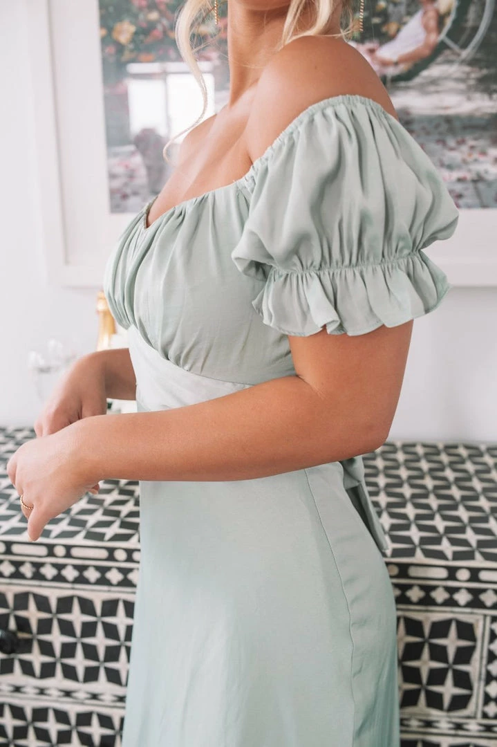 Our Lia Dress comes in a calming faded sage tone. This stunning off the shoulder midi features gathered detailing across the bust, puff sleeves with frill detailing, crossed pleated detailing under the bust, and a relaxed fitted skirt. This comfortable yet dressy piece is perfect for the upcoming festive and wedding season!