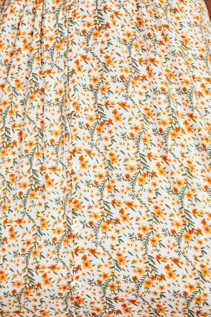 Our Agostina Dress comes in an orange tone base, with white mini floral prints. It features a v neckline & short sleeves for a relaxed, comfortable fit. This flowy midi is a wonderful addition to your summer wardrobe!