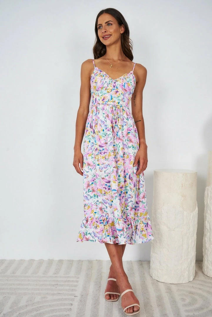 Our Haidee Dress comes in a white tone base, with a lilac, blue, gold & sage tone floral print. It features a v neckline & spaghetti straps for a relaxed, comfortable fit. This flowy, sleeveless midi pairs beautifully with heels for a stunning transseasonal look!