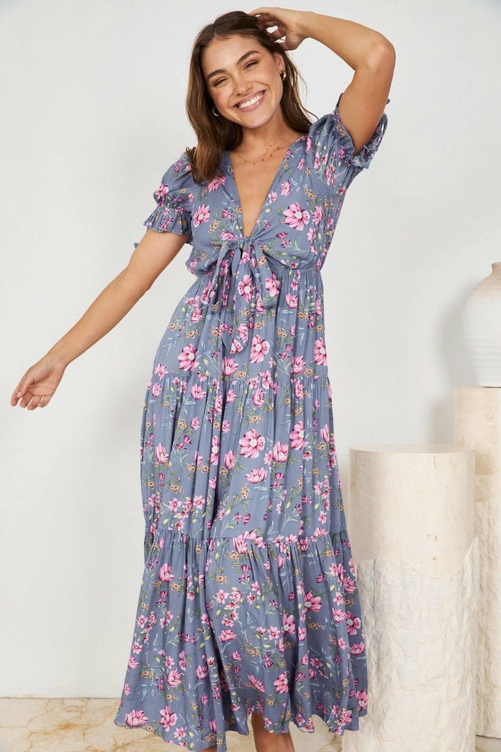 Our Lolita Dress comes in a floral print on a lovely purple base. It features a deep v-neckline with a gorgeous tie-up bust and is easily adjustable at the front. This flowy midi pairs beautifully with flats or heels for an effortless trans-seasonal look!