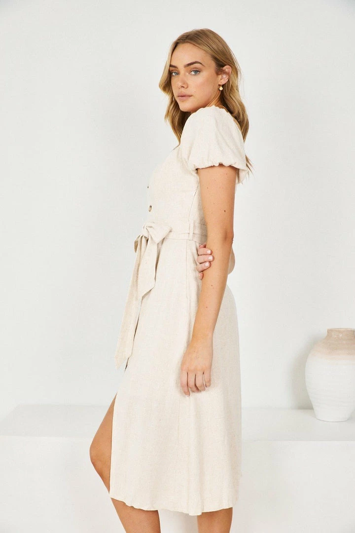 - Key Features: Midi length. Functional buttons at the front. Puff sleeves. Belt holes for the fabric waist tie. Sweetheart neckline.