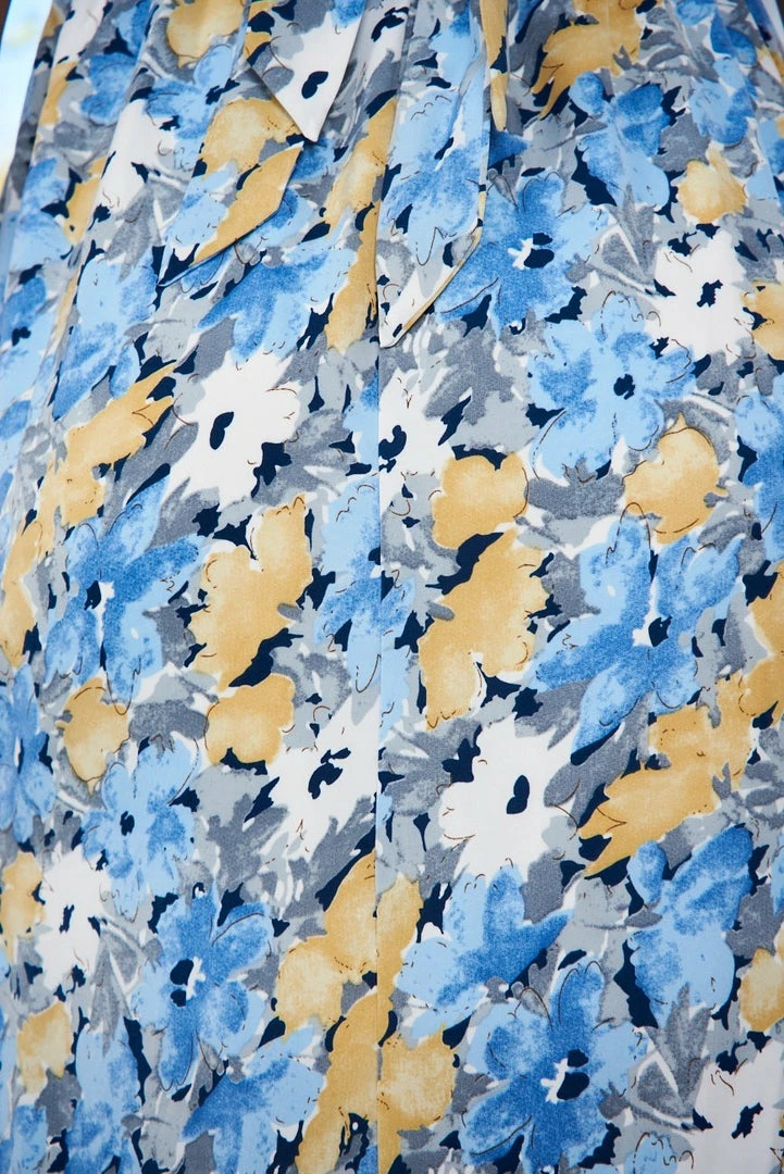 Our Jacquelina Dress comes in a blue, grey, white & yellow tone floral print. It’s a sleeveless midi that features a v neckline for a relaxed, comfortable fit. This flowy midi pairs beautifully with heels for a stunning look this spring season!