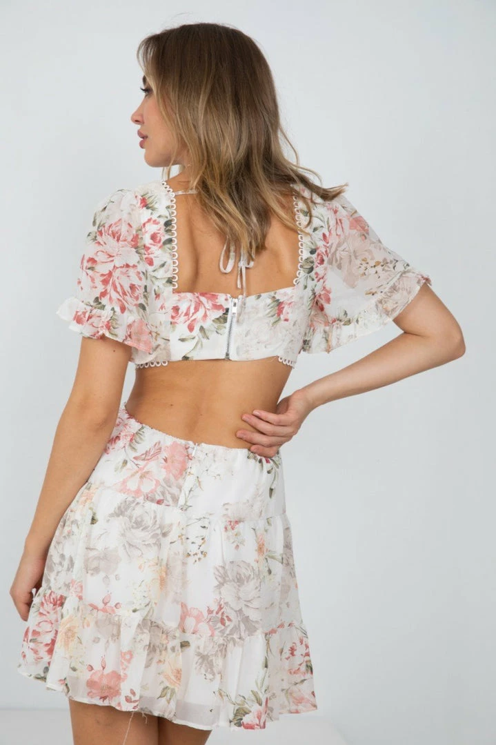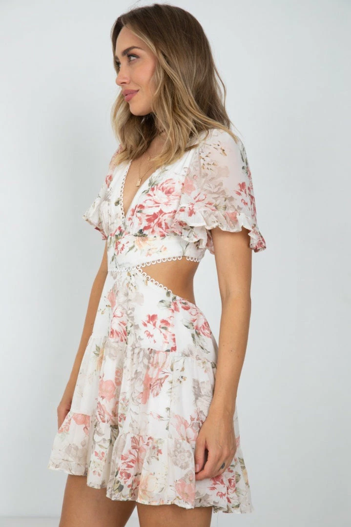 Our Jordi Dress comes in a fresh white tone base, with a grey, burgundy & beige tone print. It features a v neckline, short sleeves, and cutouts at the waist. This flowy mini pairs beautifully with heels for a stunning transseasonal look!