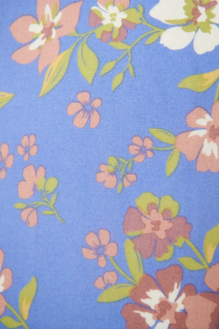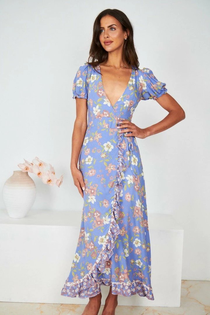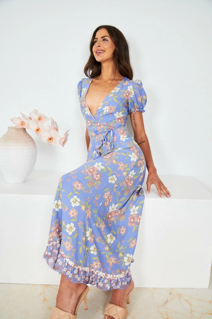 Our Kierra Dress comes in a blue tone base, with a white, beige & yellow tone floral print. It features a v neckline, short sleeves, and a fabric waist tie to cinch in the figure beautifully. This flowy maxi is a gorgeous spring dress!