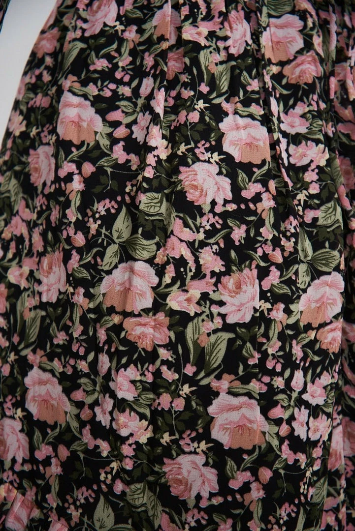 Our Melle Dress comes in a black tone base, with a sage and pink tone floral print. It features a v neckline and long bishop sleeves. This flowy midi pairs perfectly with heels for an effortless transseasonal look!