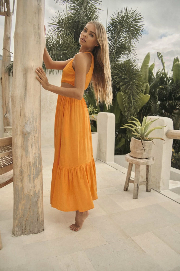 The Valencia Cut Out Dress has that carefree ease and charm you’ll want to experience every day. Featuring a mandarin colour with a high round neckline, cutouts at the sides of the waist to create that fit and flare silhouette, short sleeves, contrasted by the flowy skirt with its playful tiered skirt detailing. This feminine midi is beautifully vibrant and wears like a dream.