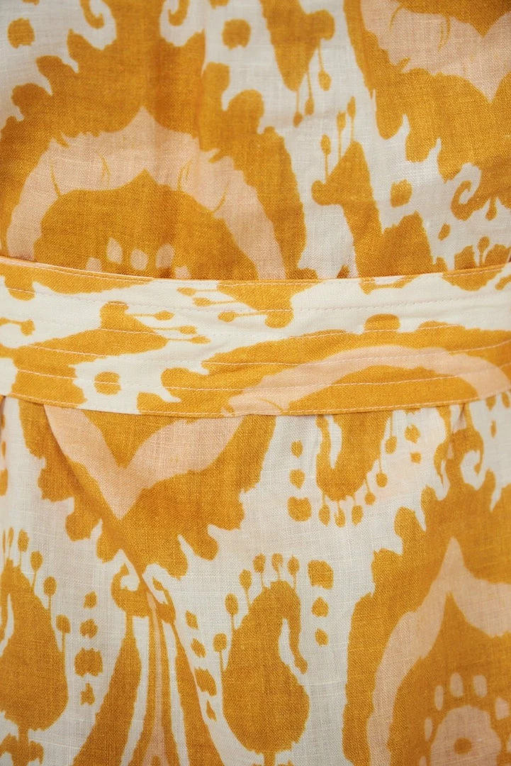 Our Abyss Dress is a fresh pop of colour, featuring marigold & white tones. This mini is a standout featuring wood button detailing, frill hemline & short puff sleeves. Pair with gold accessories for a gorgeous cruise style outfit.