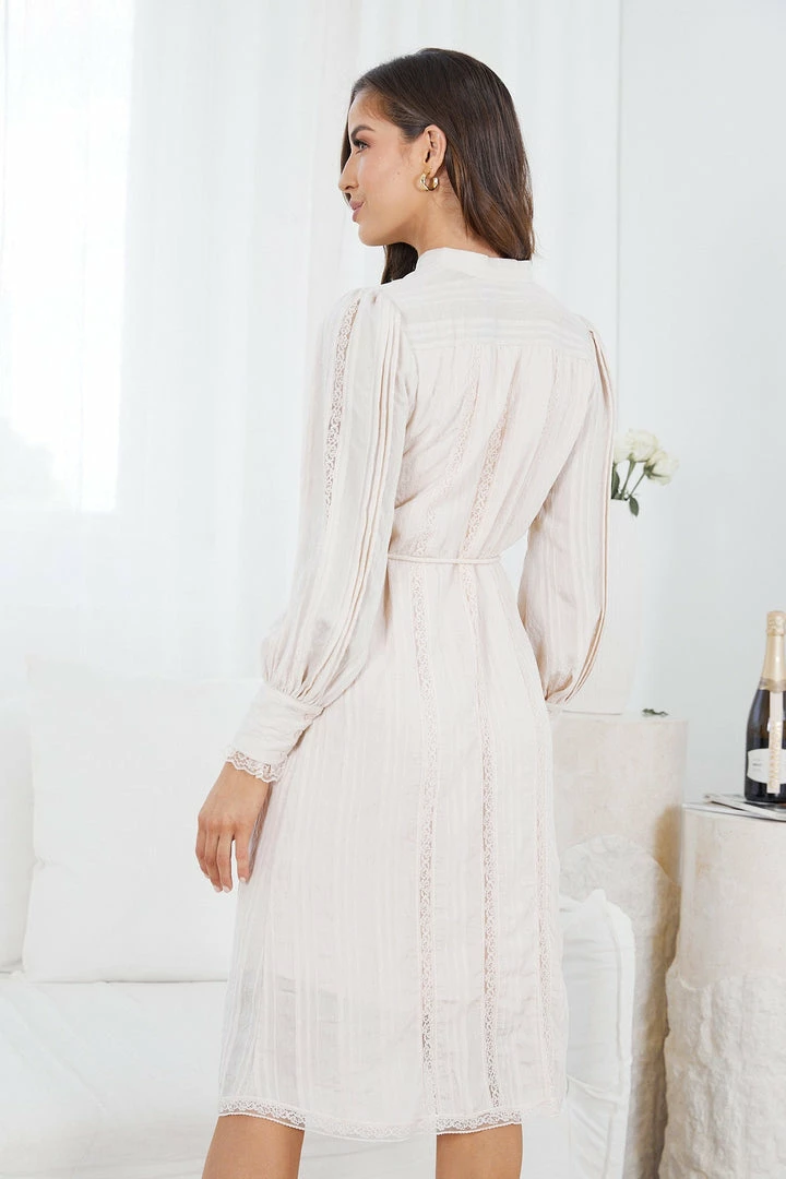 Our Aurorie Dress comes in a pretty cream colour. Create magical moments in this midi dress that features a stand collar, functional buttons, cuffed long sleeves, pleated detailing and waist tie to embrace your shape beautifully. The lace trimmings and frills add a feminine doll-like aura that’s perfect for pairing with mary jane heels.