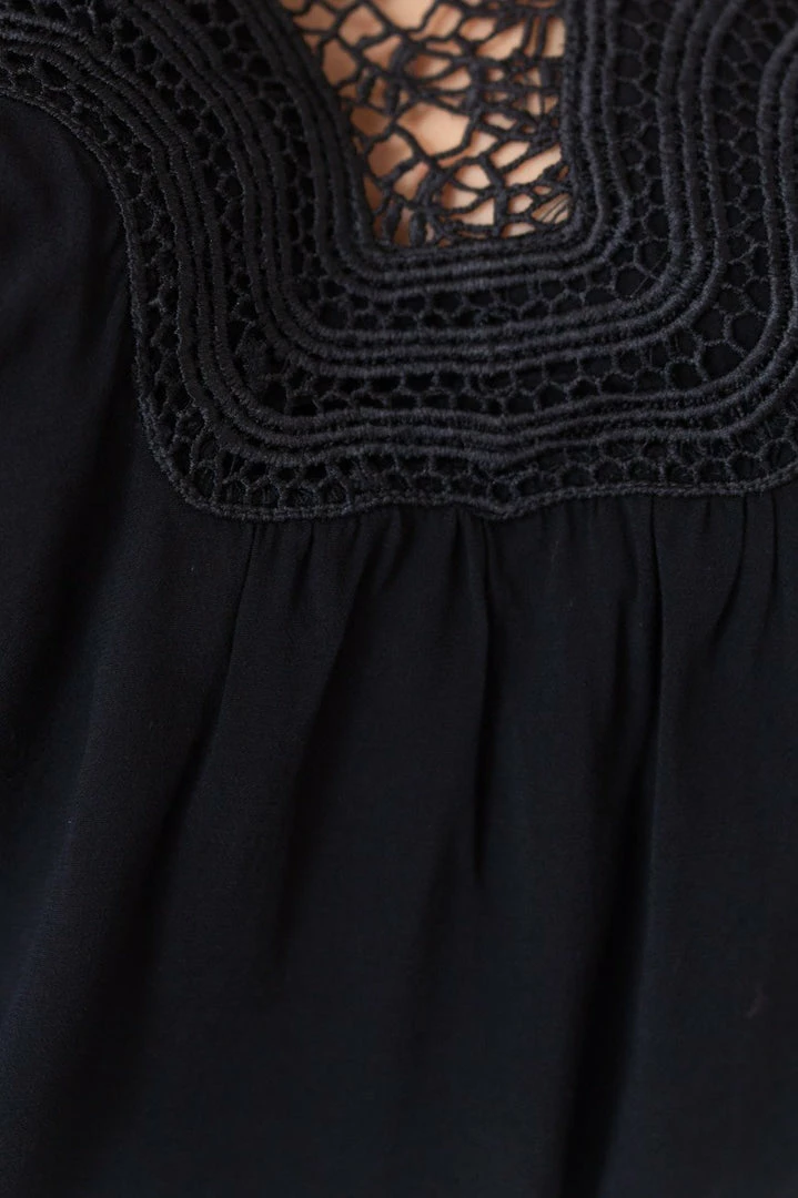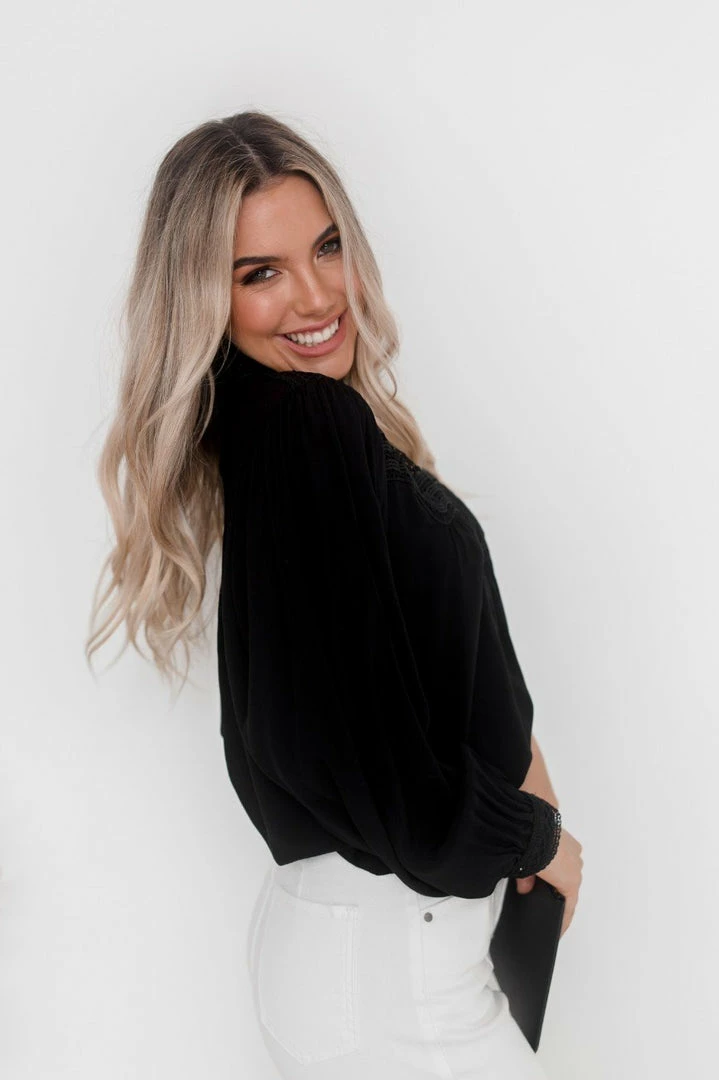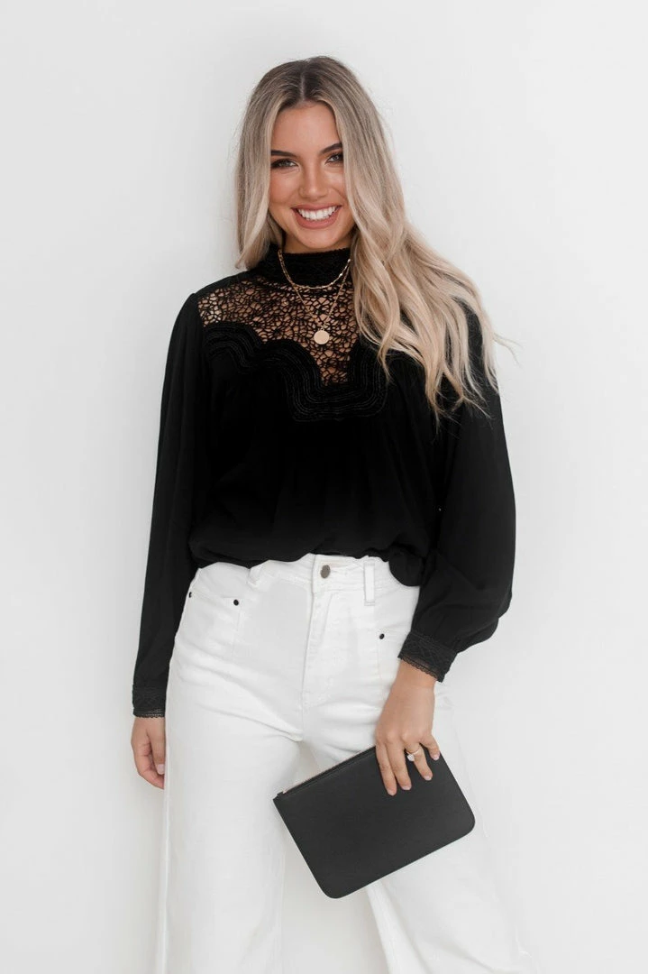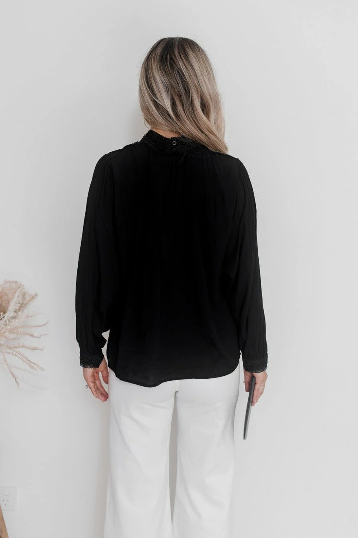 Our Caja Top is a deep black tone. It features a high collar done up at the back, long sleeves and lace-style detailing on the bust. This gorgeous top pairs beautifully with your favourite pair of pants for a stunning evening look!