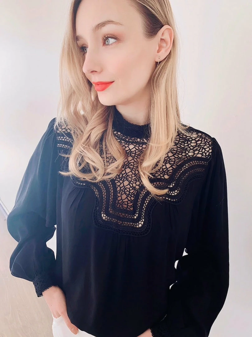 - Key Features: Relaxed fit. High neckline. Long Sleeves. Lace-style detailing.