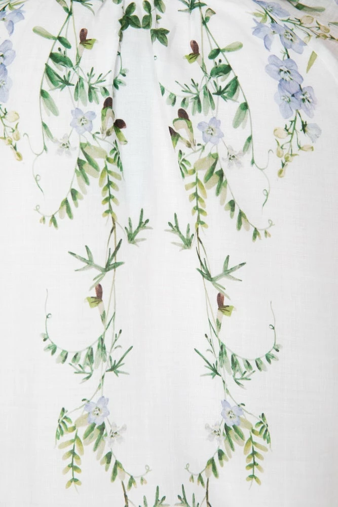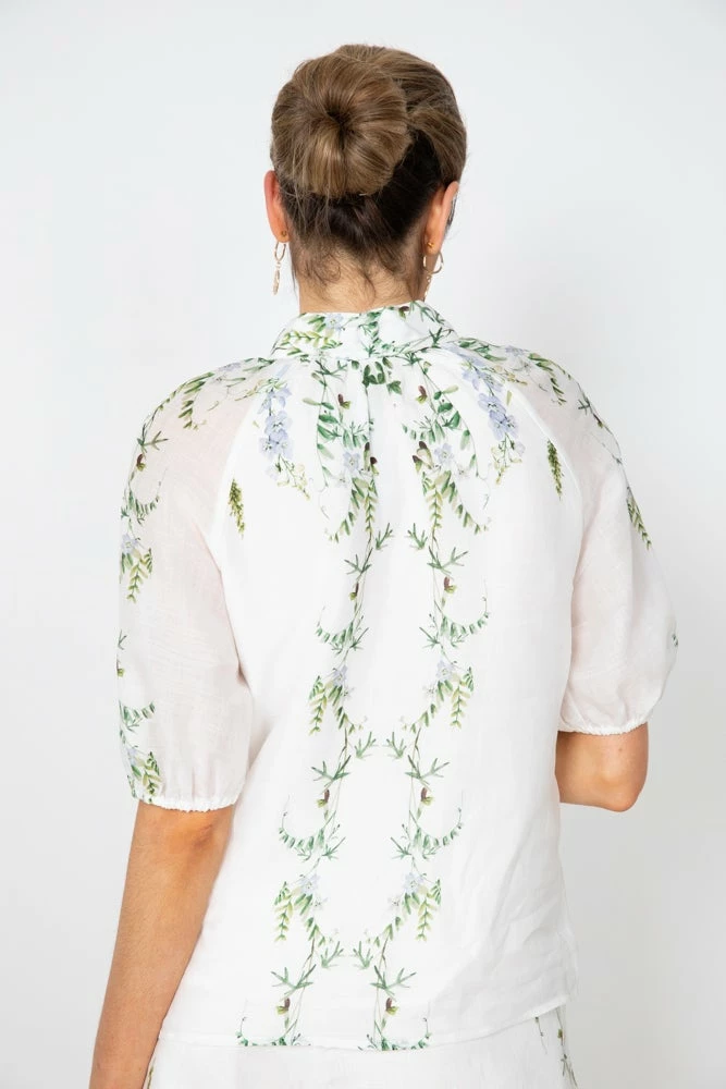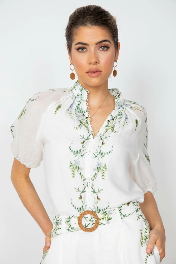 Our Lorain Blouse is a vintage white tone with sage and lavender prints. It’s a gorgeous lightweight material ideal for the warmer months to come and transitioning you to Spring. The collars are adorned with crochet detailing with buttons met in the middle. Complete the look with our Floella Belted Shorts – Green Print!