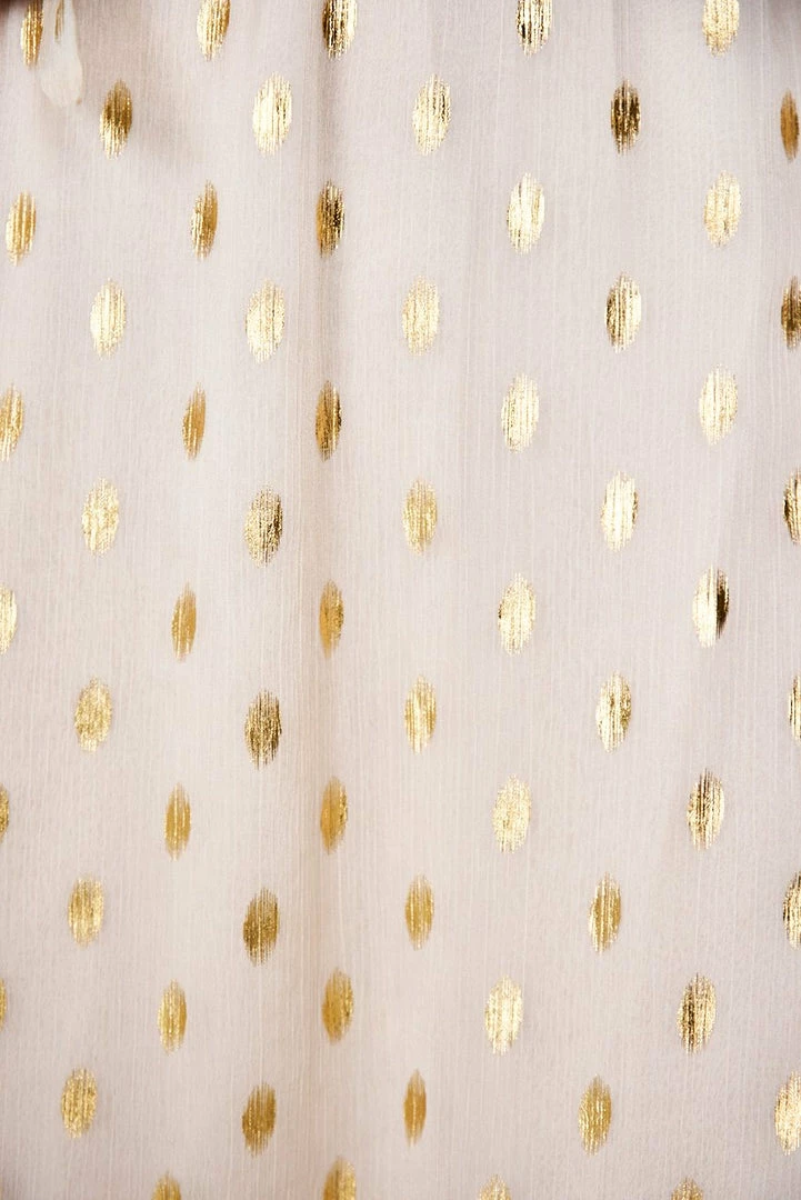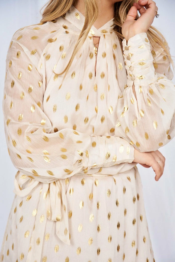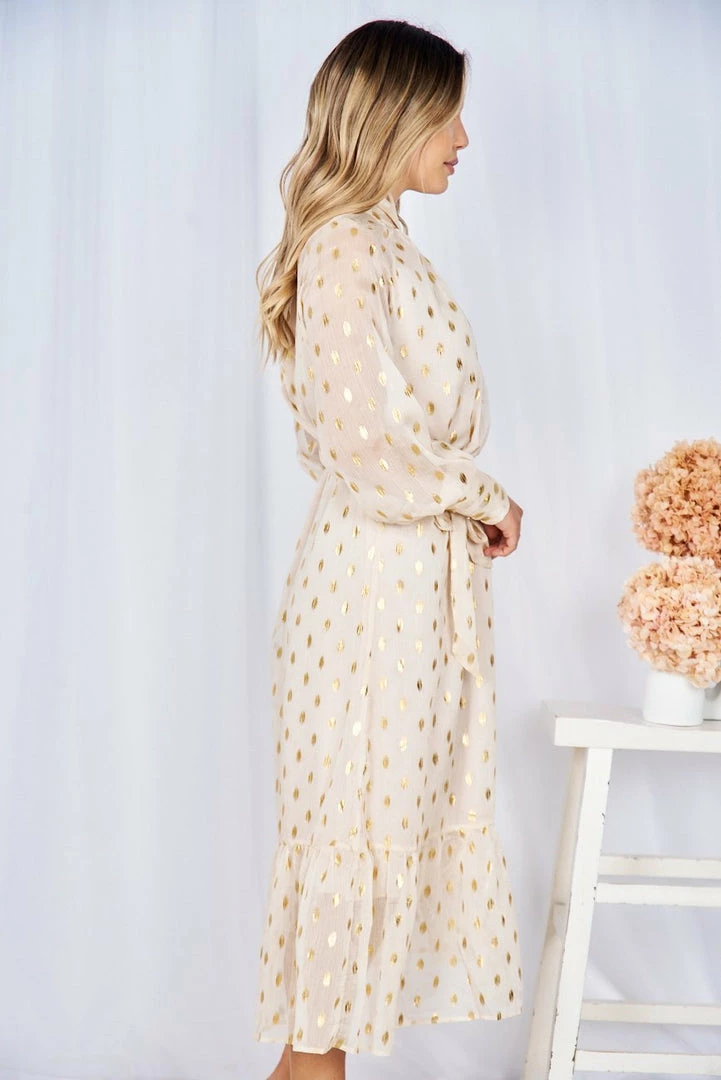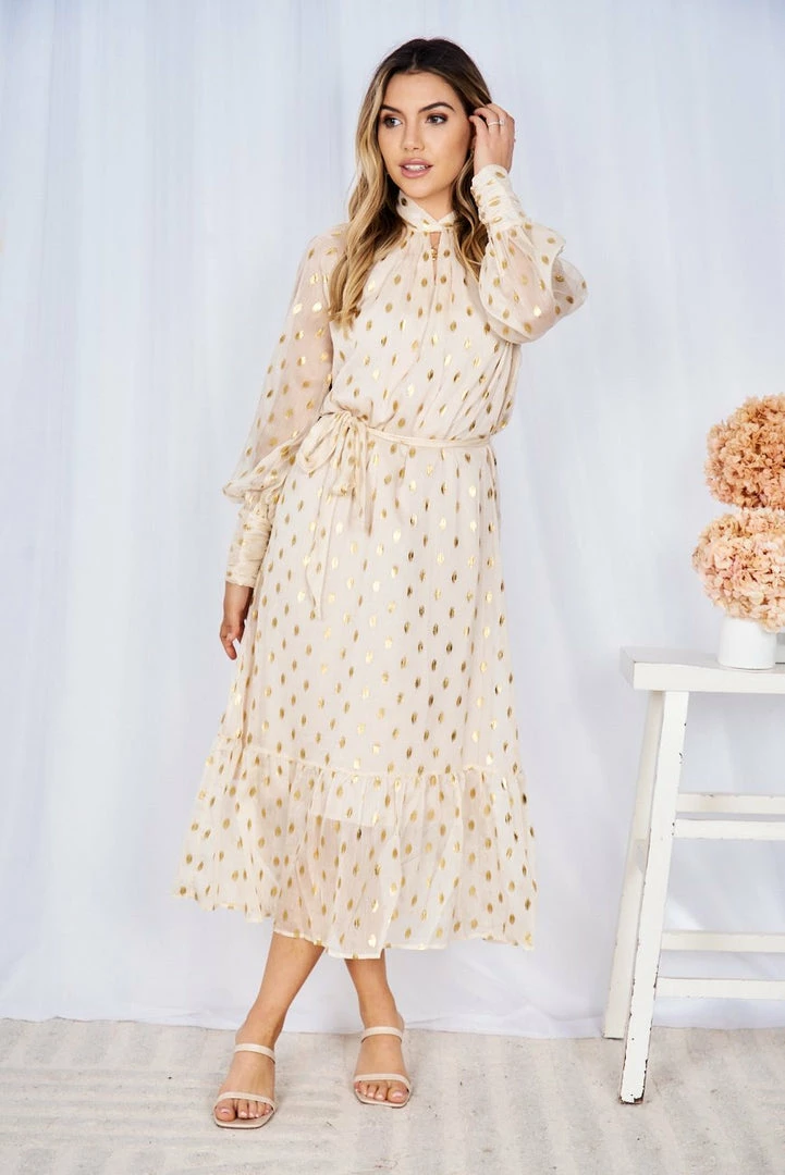 Our Annamae Dress comes in a warm cream tone base, with a contrasting gold tone spot print. It features a high neckline, long bishop sleeves, and a fabric waist tie to cinch in the figure beautifully. This stunning midi pairs beautifully with heels for an elegant, classy look!