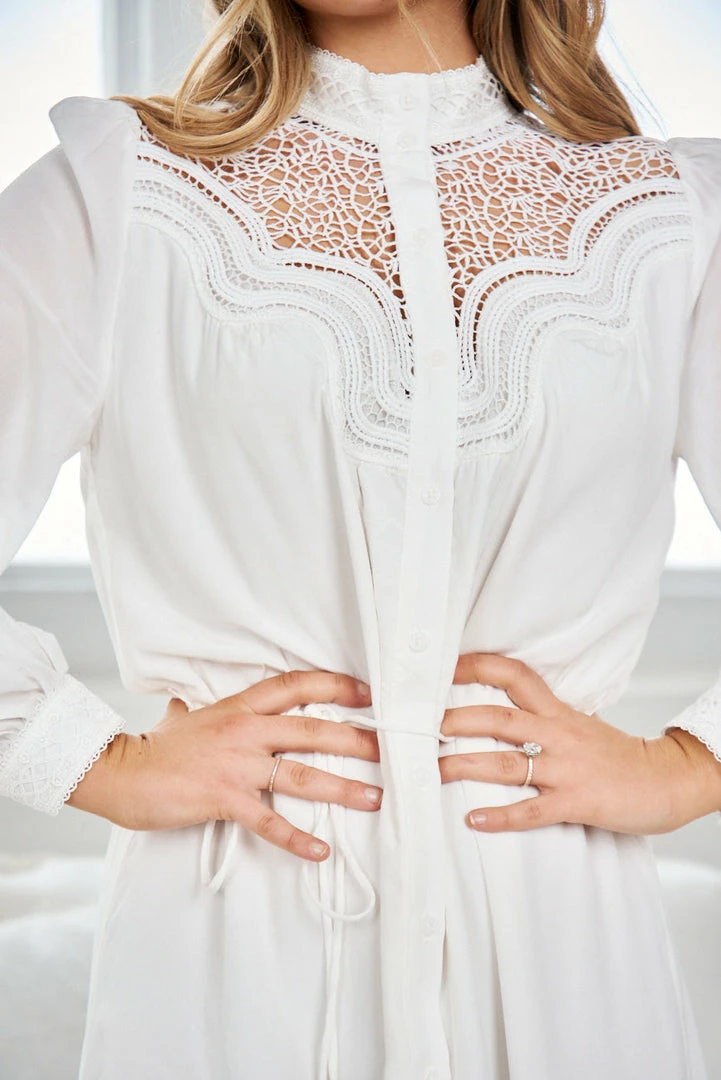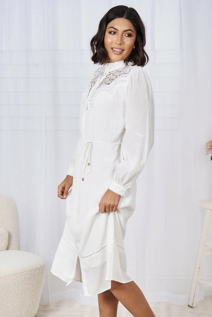 Our Calida Dress is a crisp white tone. It features a high neckline, long sleeves with traditional cuffs, and an embroidered pattern across the chest and shoulders. Pair with your favourite pair of heels for a stunning formal look!