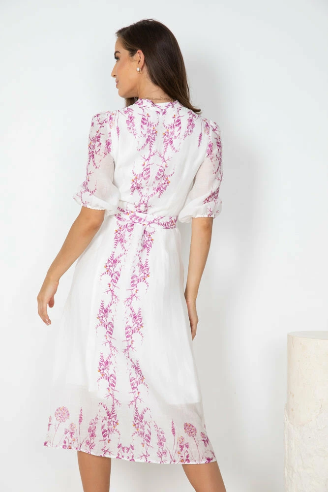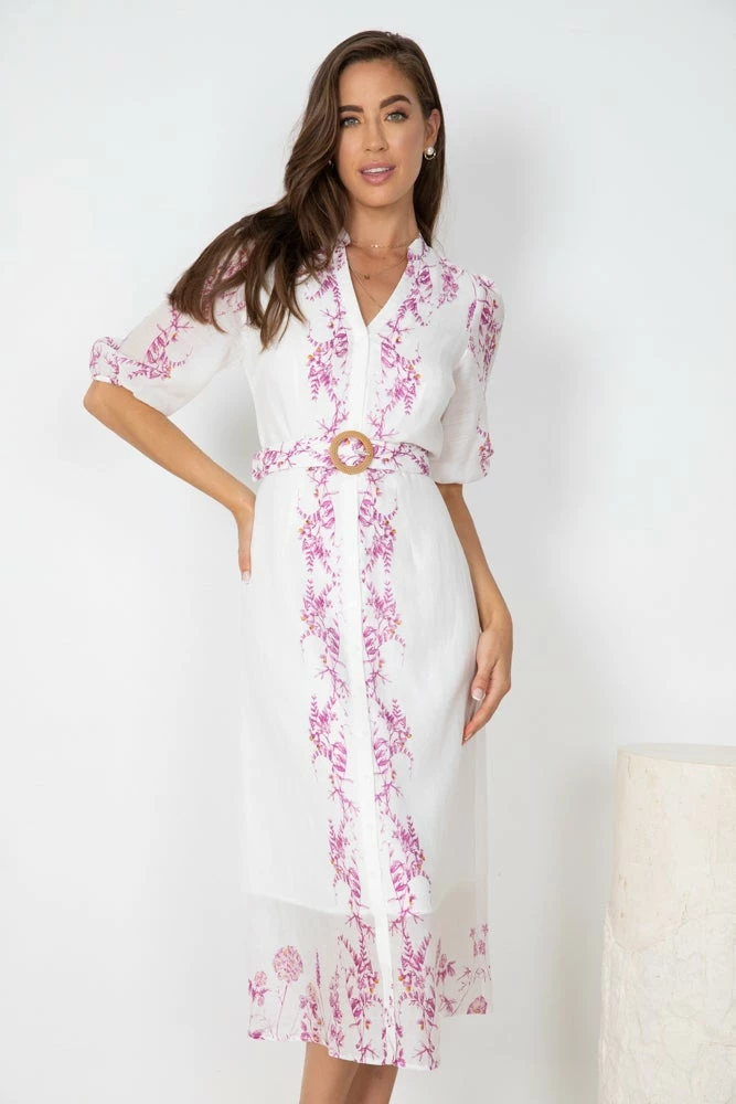 - Key Features: Midi Length. Cinched elbow-length sleeves. V neckline. Fabric belt. Functional Button Through at Centre Front.