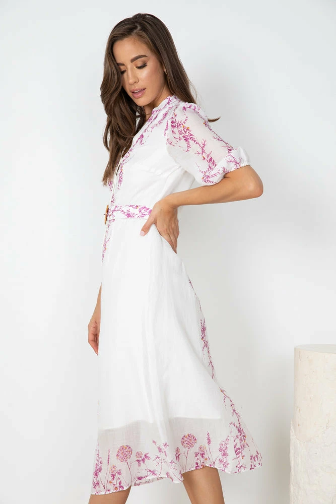 Our Lenny Dress comes in a white tone base with pink prints. This dress features a v neckline with buttons down the front, cinched elbow-length sleeves, and a matching fabric belt to flaunt the waist. Paired with a sunhat, this bright piece is perfect for brunch dates and weekend picnics!
