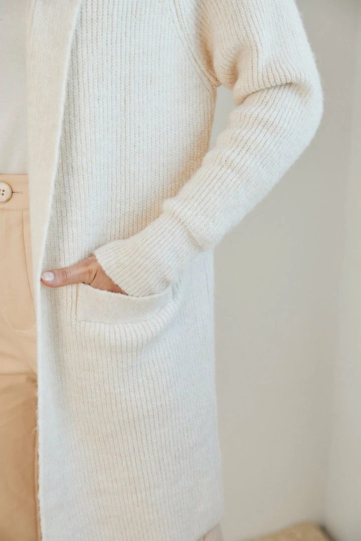- Key Features: Long sleeves. Functional side pockets. Open front. Knit Fabric.