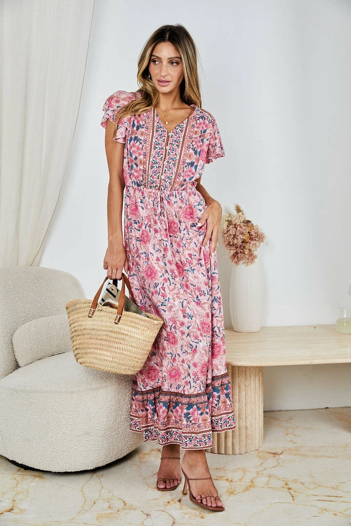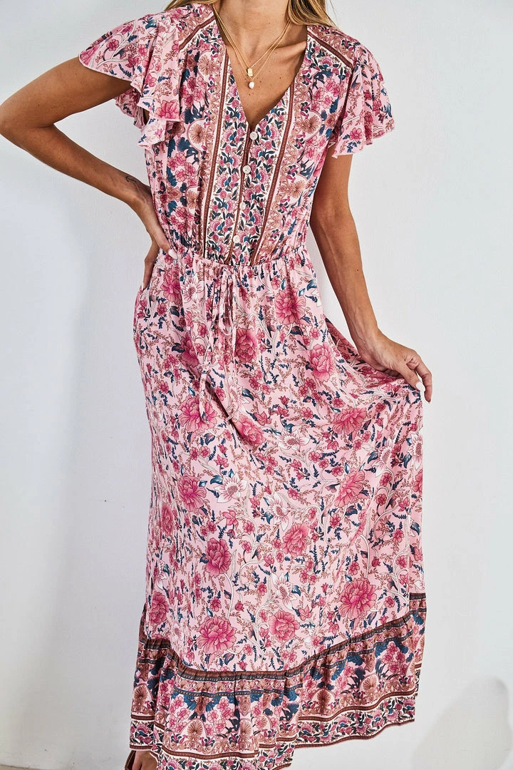 Our Arthea Dress comes in an eden pink tone base, with a purple, brown & blush tone print in a relaxed fit. This midi features a v neckline and adjustable waist drawstring is a comfortable addition whilst the gathered detailing on the waist cinches in the figure.