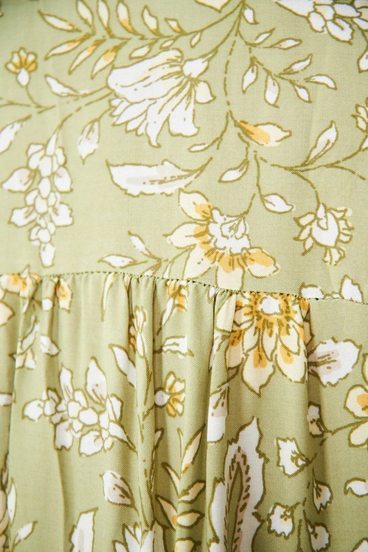 Our Aurina Dress comes in a green base with tones of grey, yellow and white prints. It’s a gorgeous lightweight material perfect for transitioning you to Spring. The peasant v neckline with tassel finishes is a gorgeous addition to this bohemian style. The short bishop sleeves are cinched with elastic on the cuffs making this practical and comfortable. The mini length is perfect for showing off your gorgeous legs!