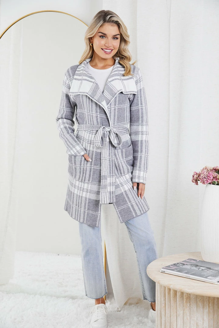 Our Caesarea Coat comes in grey and white plaid print. Catch the winter vibes in a polished look in this long sleeved jacket featuring a wing collar, mid length hem and an adjustable tie belt to accentuate your waist. Pair with flared pants for a relaxed chic outfit.