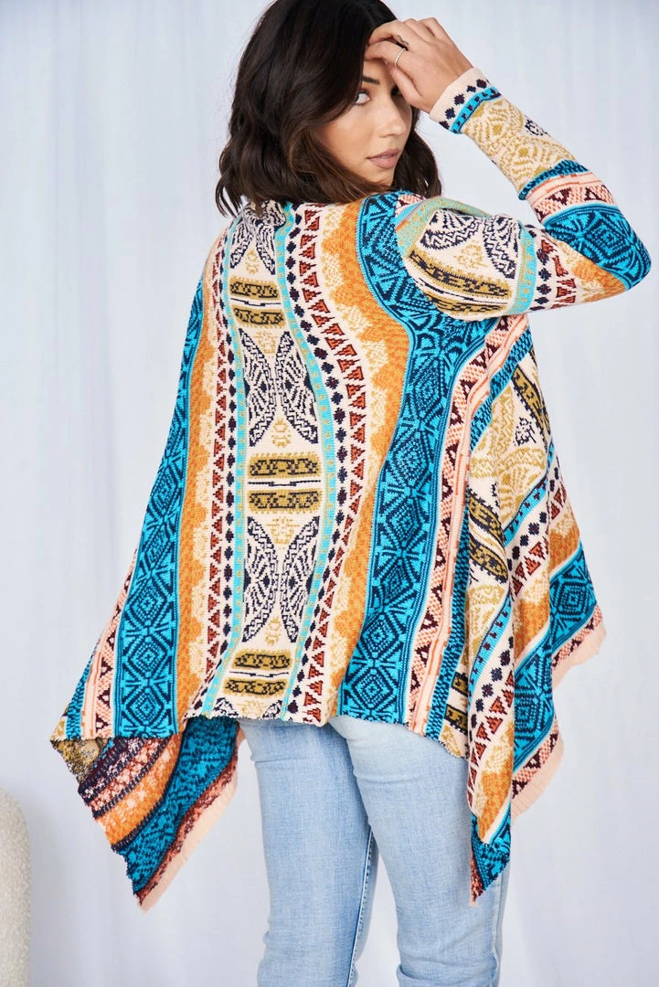 Our Adamina Cardigan comes in an aqua, rust, orange & beige tone print. It features long relaxed sleeves for a comfortable, luxurious fit. This cute cardi is perfect for layering during the colder months!