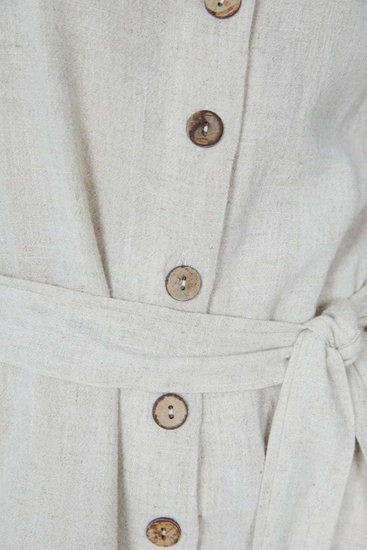 - Key Features: Midi Length. V neckline. Buttons down the front. Fabric waist tie.