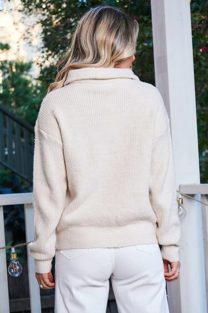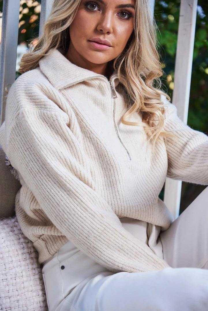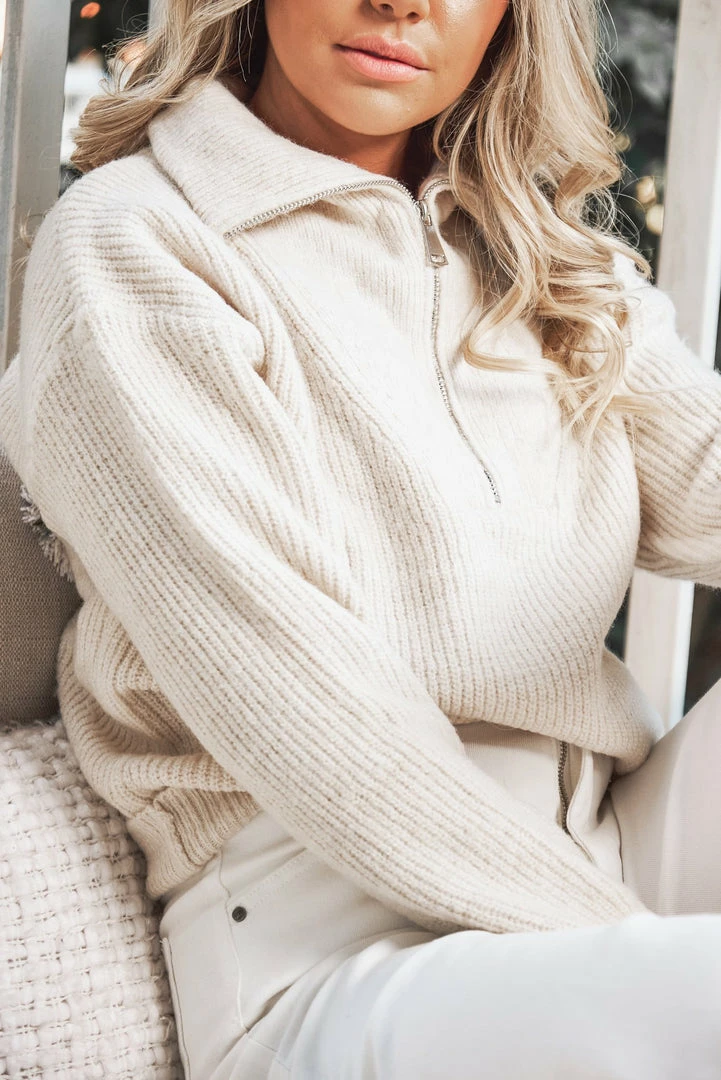 Our Merete Knit comes in a neutral beige tone. It features a high collar that comes together with a zipper, long relaxed sleeves and a contrasting rib knit pattern all over the garment. This relaxed knit is perfect for layering during the colder months ahead!