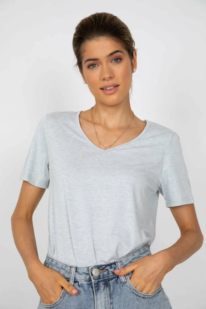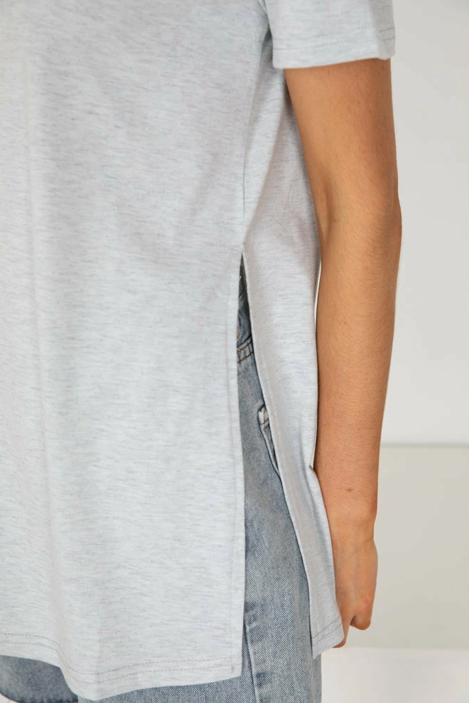 - Key Features: Relaxed fit. V neckline. Slit on sides. Short sleeves.
