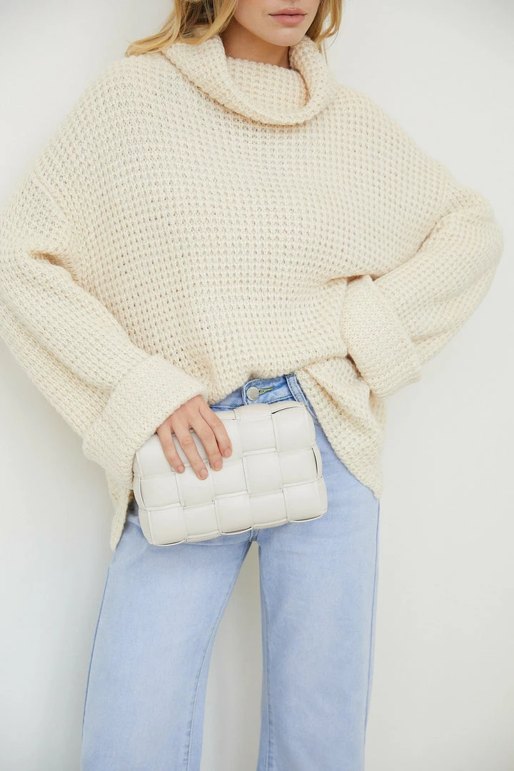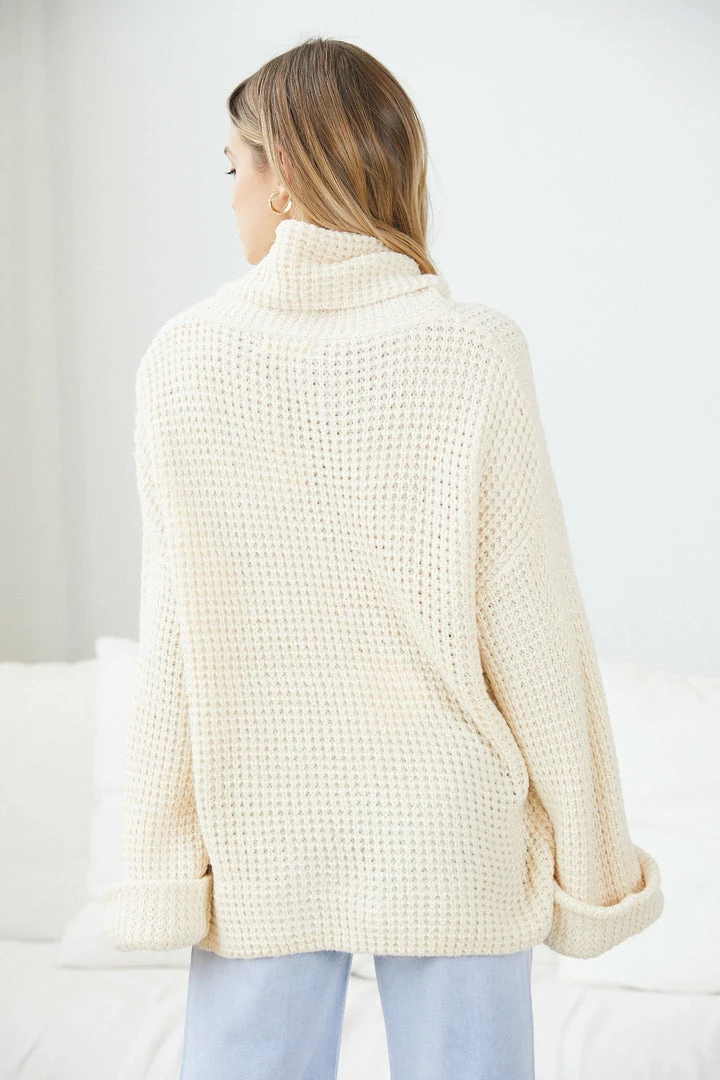Our Phylis Knit comes in a beautiful cream tone. It features a turtle neckline, long relaxed sleeves, and a textured knit pattern down all over the garment. This knit is perfect for layering during the cold winter months!
