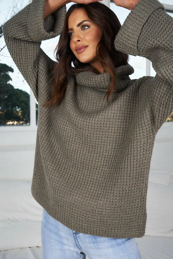 Our Phylis Knit comes in a dark khaki tone. It features a turtle neckline, long relaxed sleeves, and a textured knit pattern down all over the garment. This knit is perfect for layering during the cold winter months!