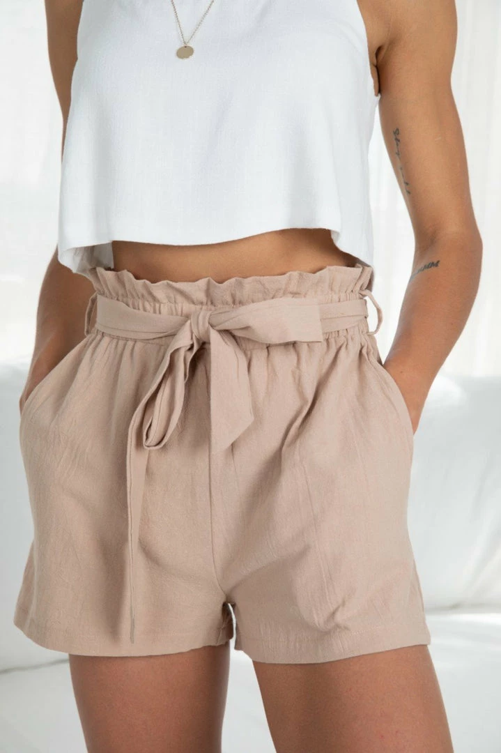 Our Detta Shorts come in a neutral coffee-colored tone. They feature a mini-length, an elasticated waistband, and a fabric waist tie. These shorts are perfect for the warm months of spring and summer!