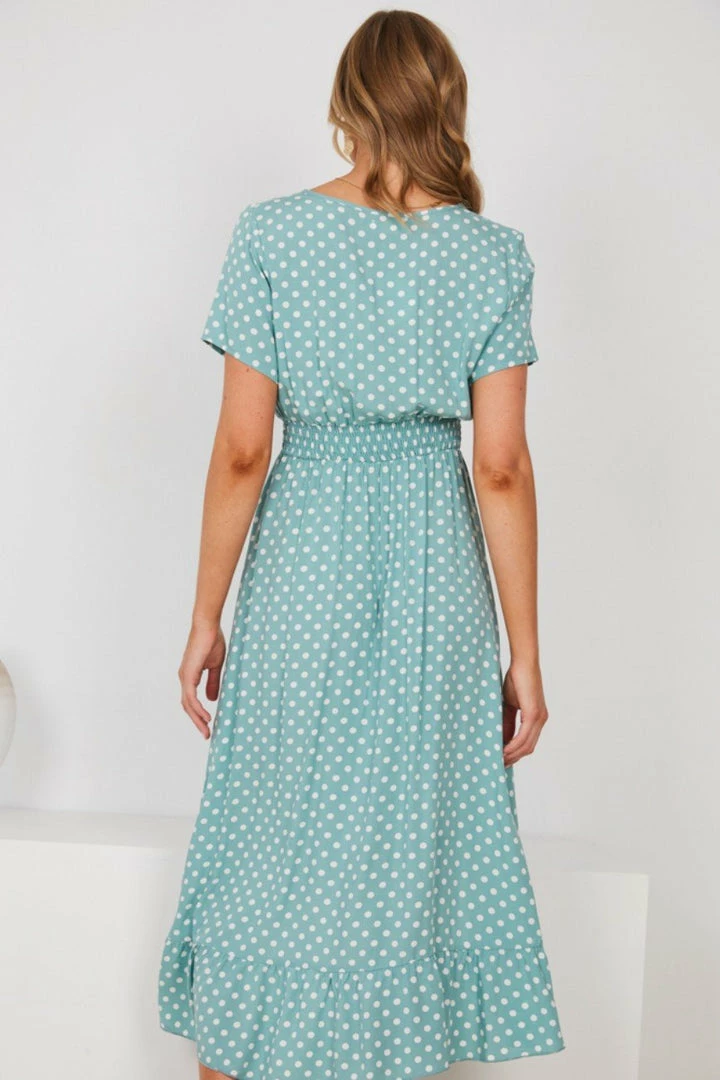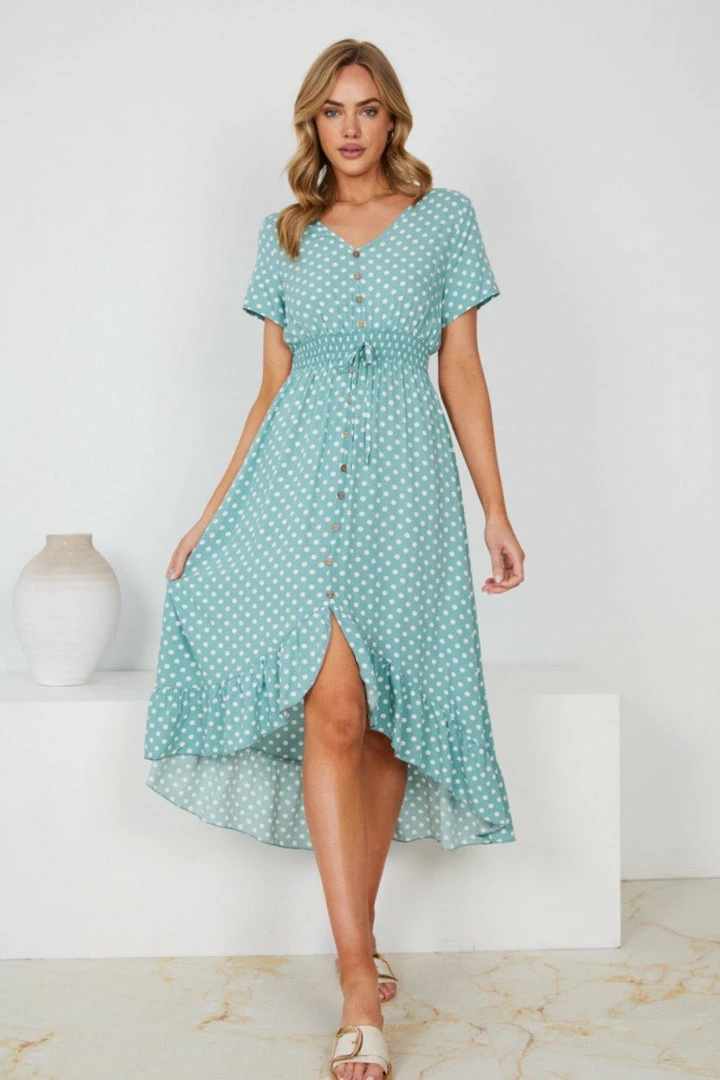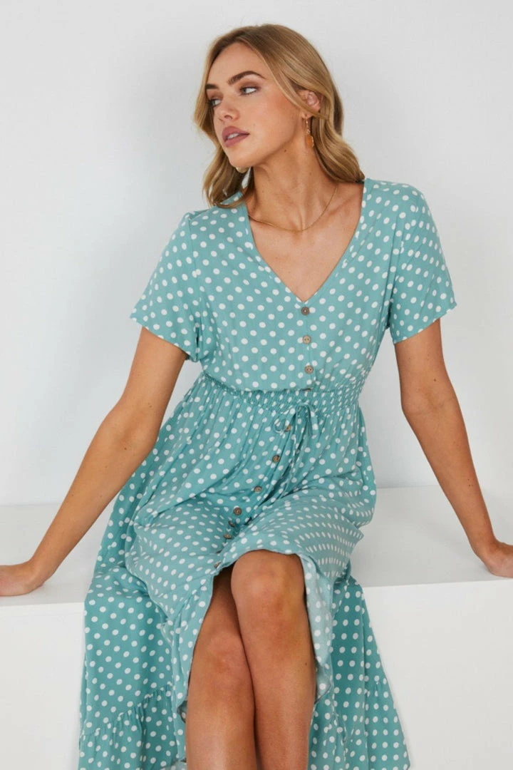 Our Adley Dress comes in a sage base with white spot prints. The Midi features a v neckline with buttons on the front and a flowy skirt that wears like a dream! The relaxed fit mid pairs beautifully with tan sandals and gold accessories.