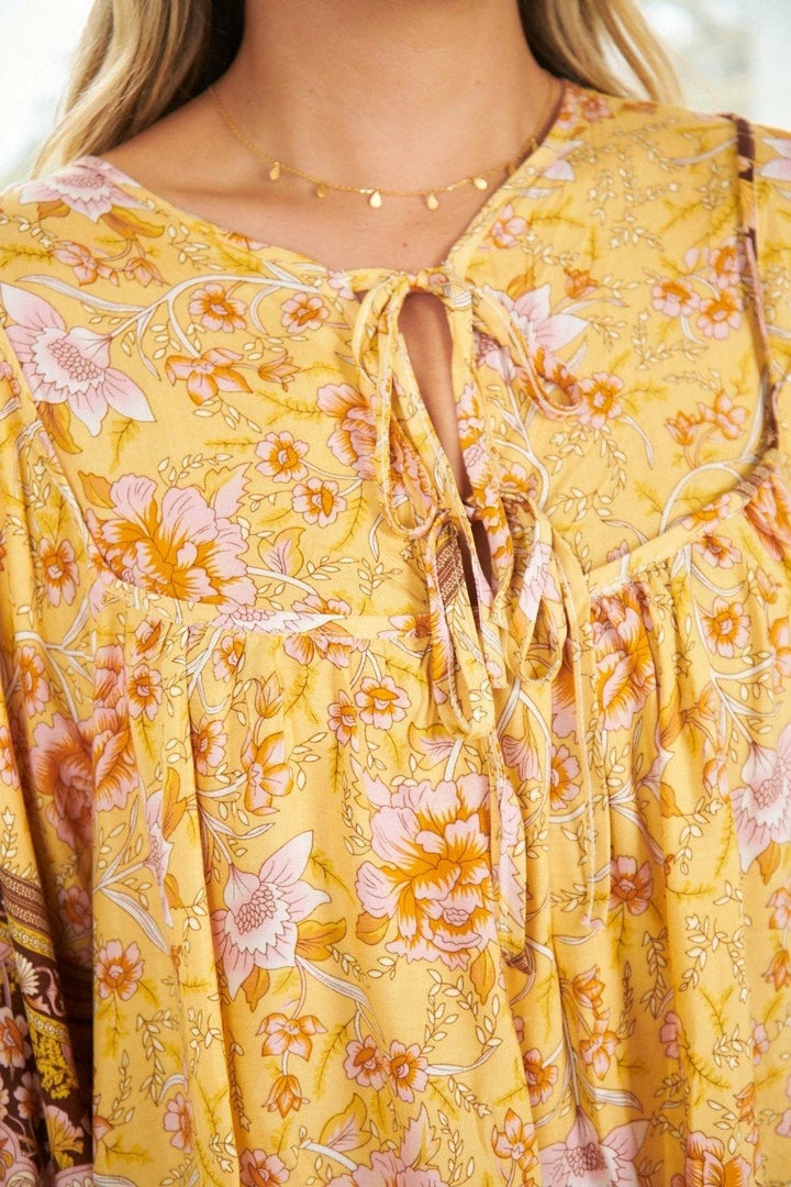 Our Luisyana Dress is a vibrant yellow, olive, dark mustard, brown & cream-toned floral print mini in a peasant-style dress that oozes fabness! The v neckline has a tie detail featuring a tassel that adds texture to the top. The balloon short sleeves are a fun & flirty addition to the wardrobe.