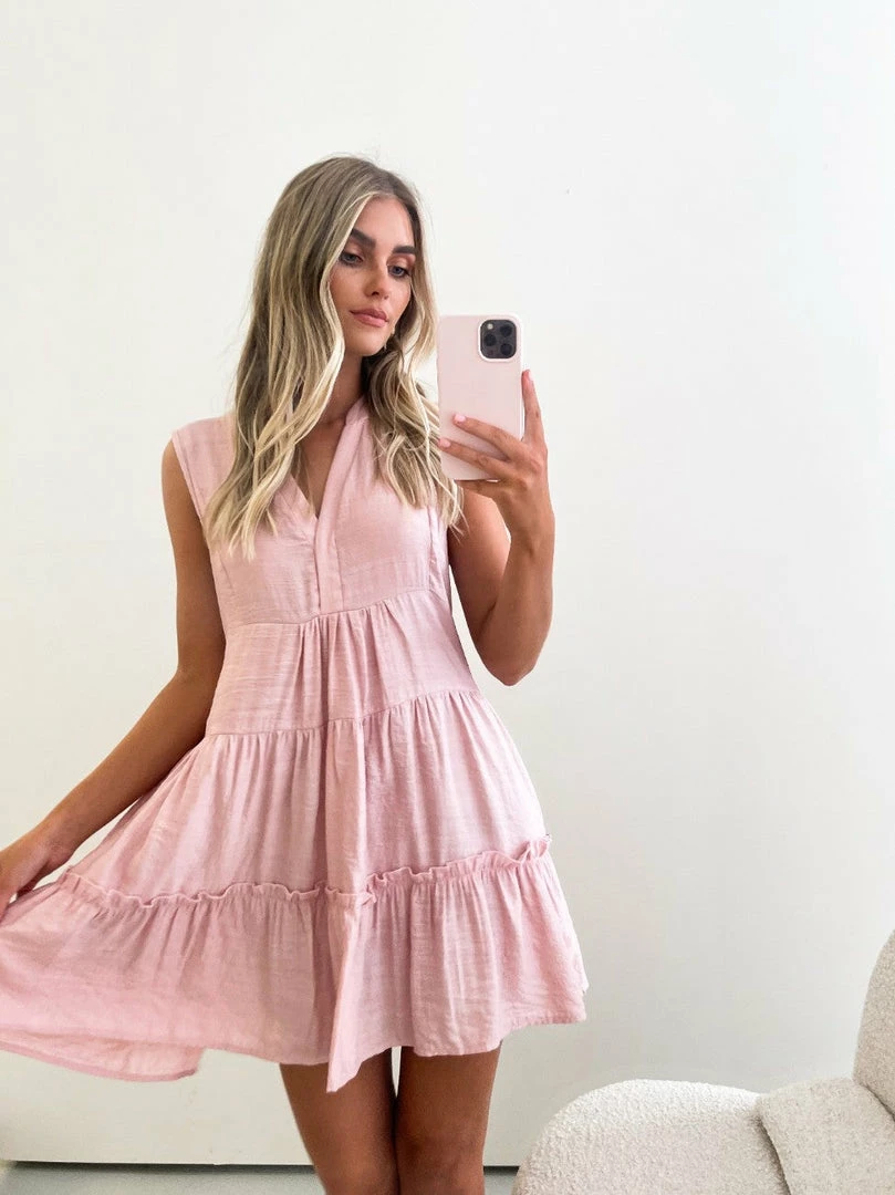 Our Marita Dress comes in a blush tone in a relaxed fit. This mini features a v neckline, semi-mandarin collar, and is sleeveless, complemented by the tiered skirt. Pair with your favourite pair of tan sandals for an effortless spring look.