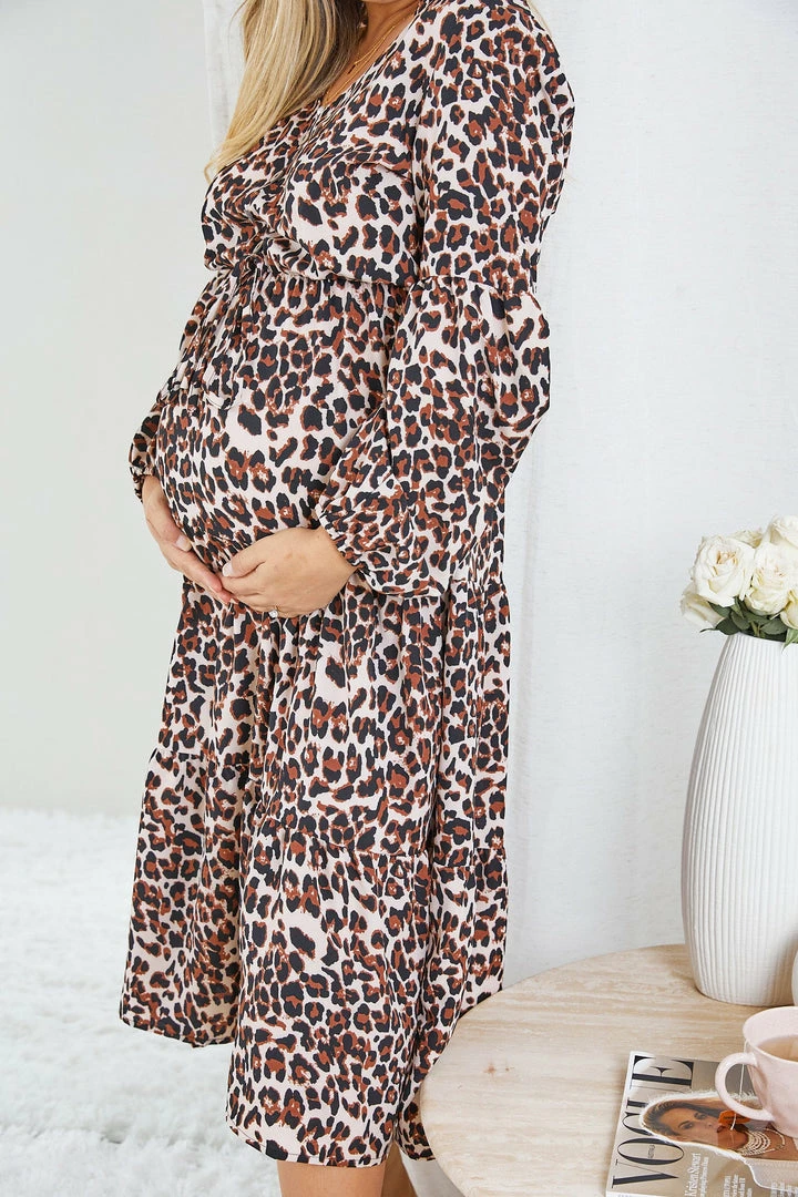 Our Merlyn Dress comes in a leopard print. This features a v neckline, long cinched cuffs, and a fabric waist tie to flaunt the waist. The relaxed fit pairs beautifully tan heels, and gold accessories.