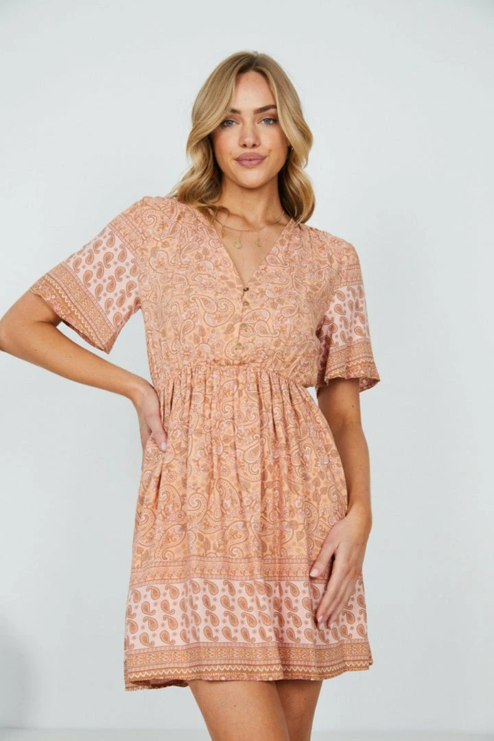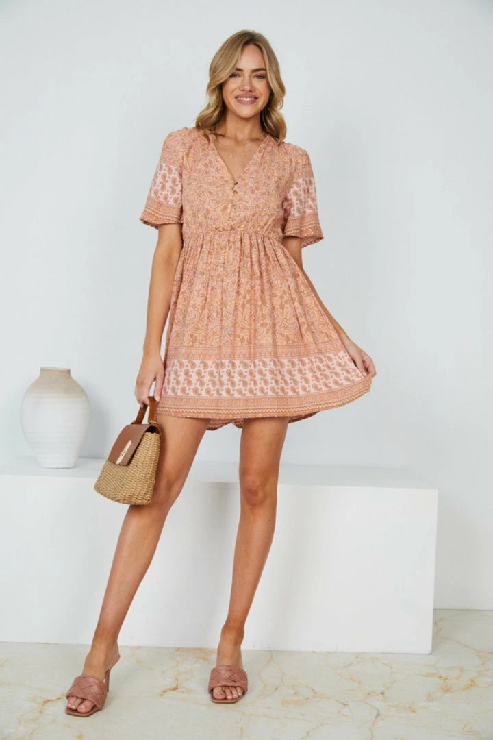 Our Ricarda Dress features a rust and pink base with a brown tone print. It’s a gorgeous lightweight material ideal in a relaxed mini dress silhouette that is perfect for days spent in the sunshine. The V neckline is met with buttons making this ideal for breastfeeding. The short sleeves flutter out and are a feminine complementary feature to the gorgeously gathered waist detailing of the garment.