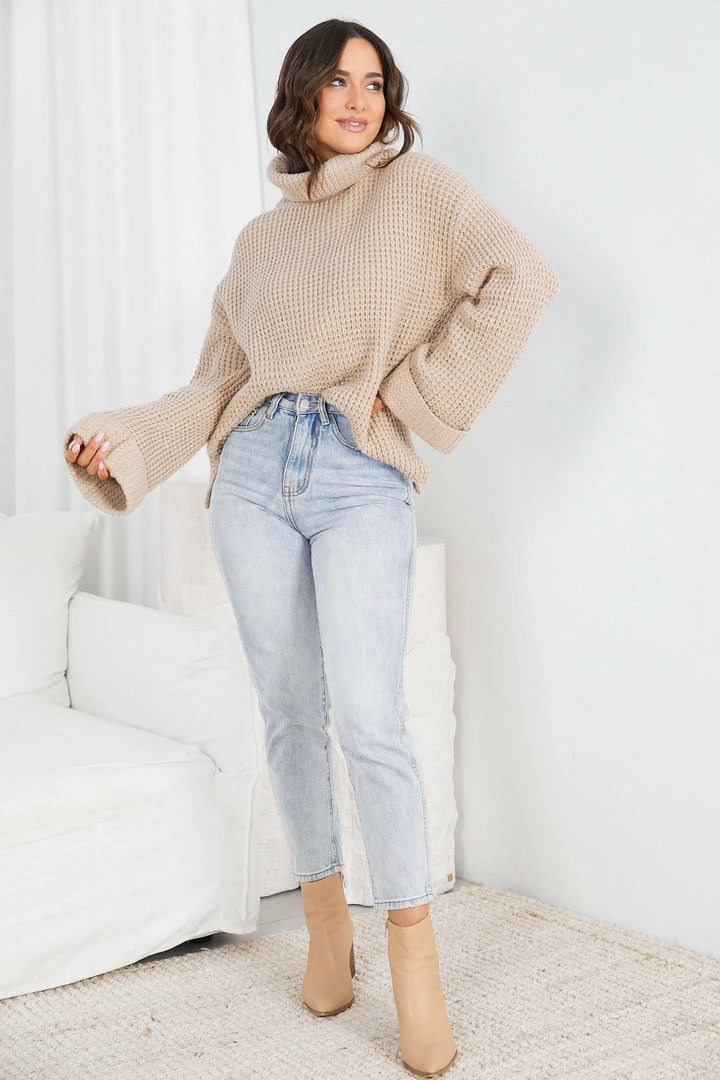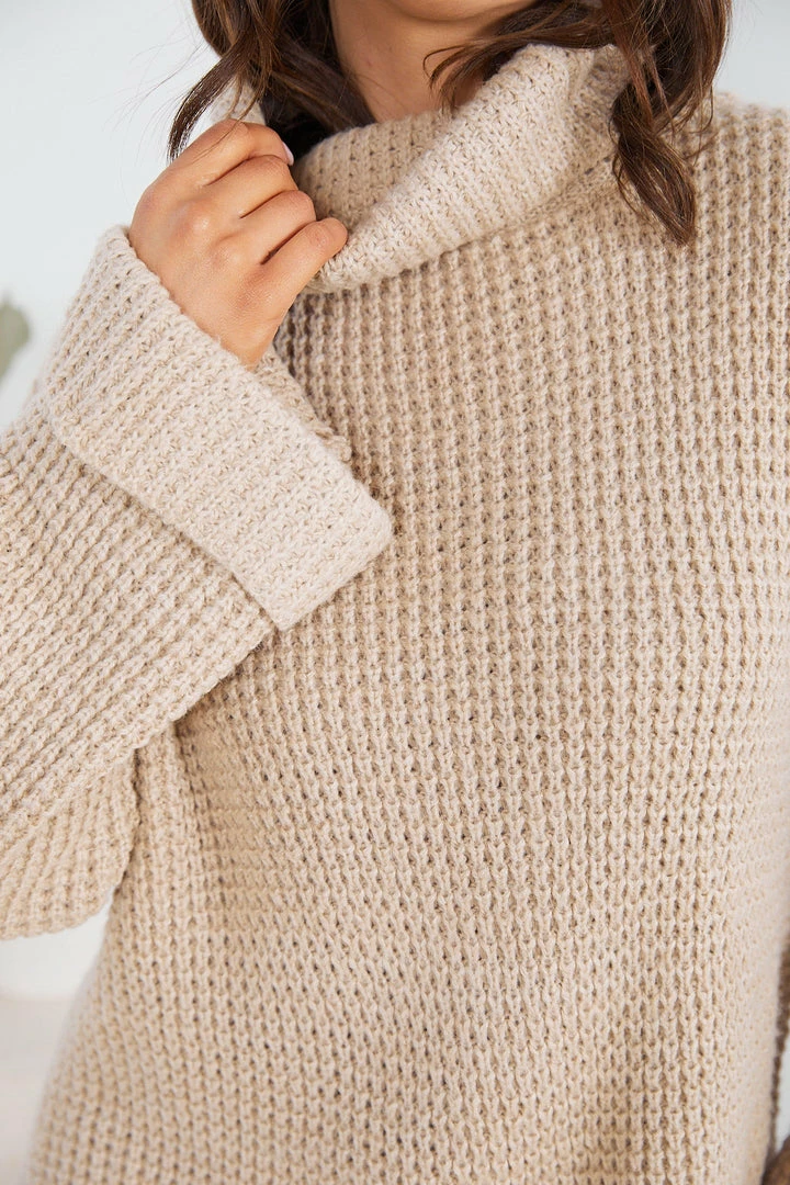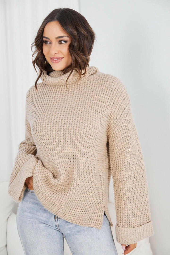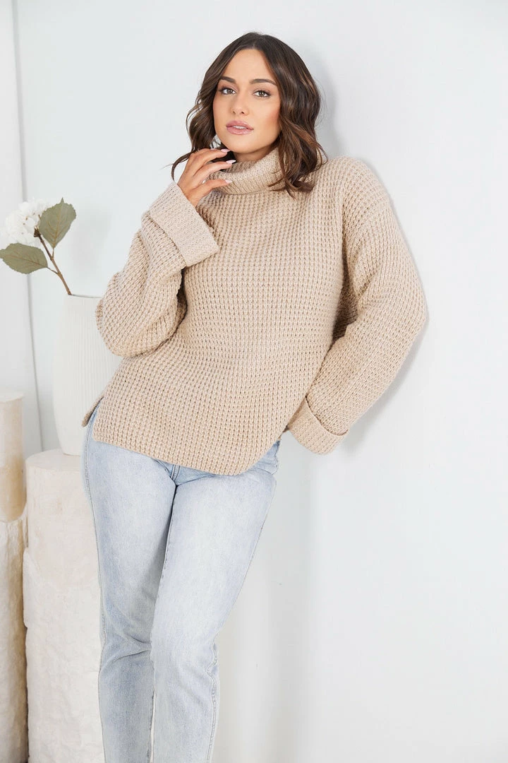 Our Phylis Knit comes in a beautiful beige tone. It features a turtle neckline, long relaxed sleeves, and a textured knit pattern down all over the garment. This knit is perfect for layering during the cold winter months!