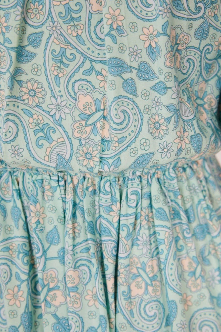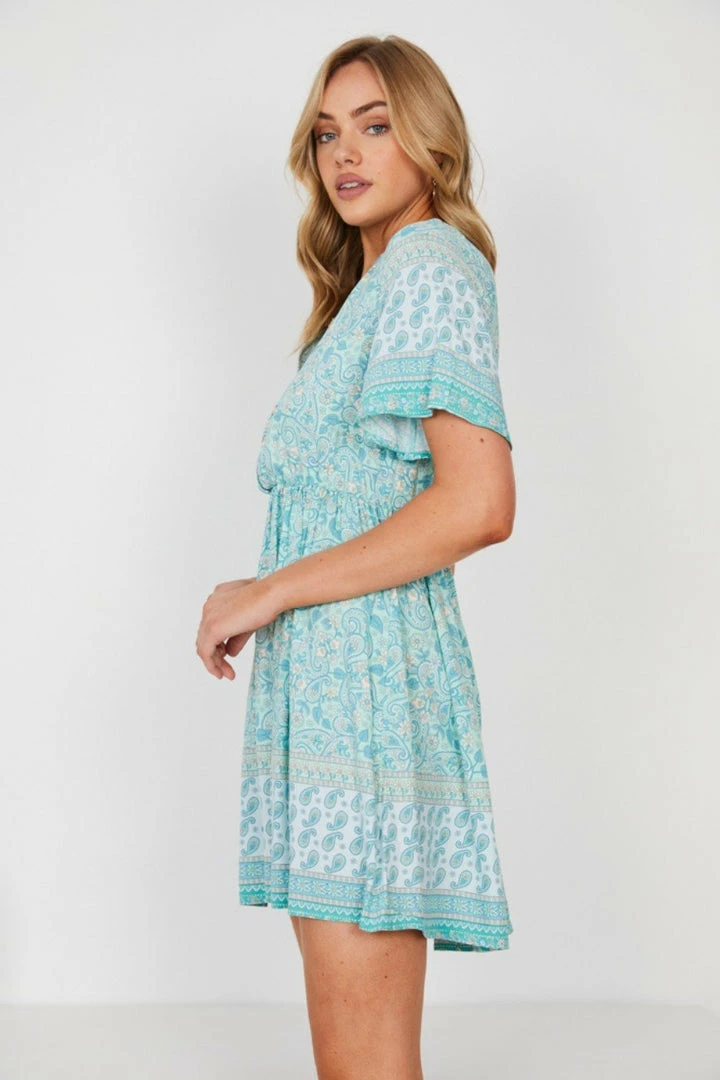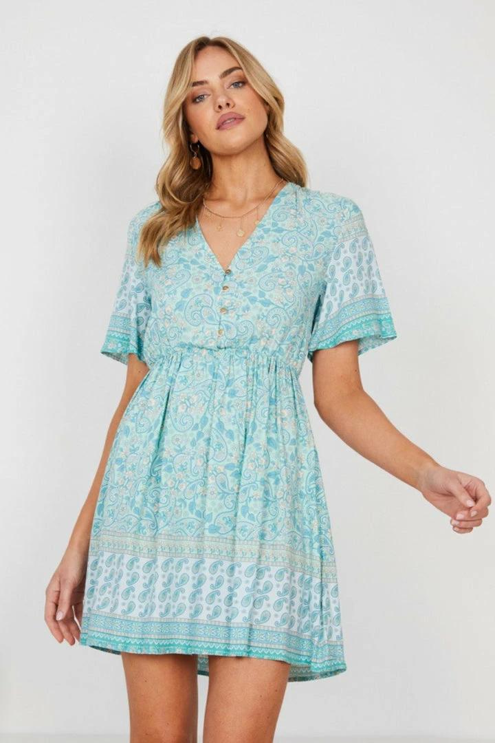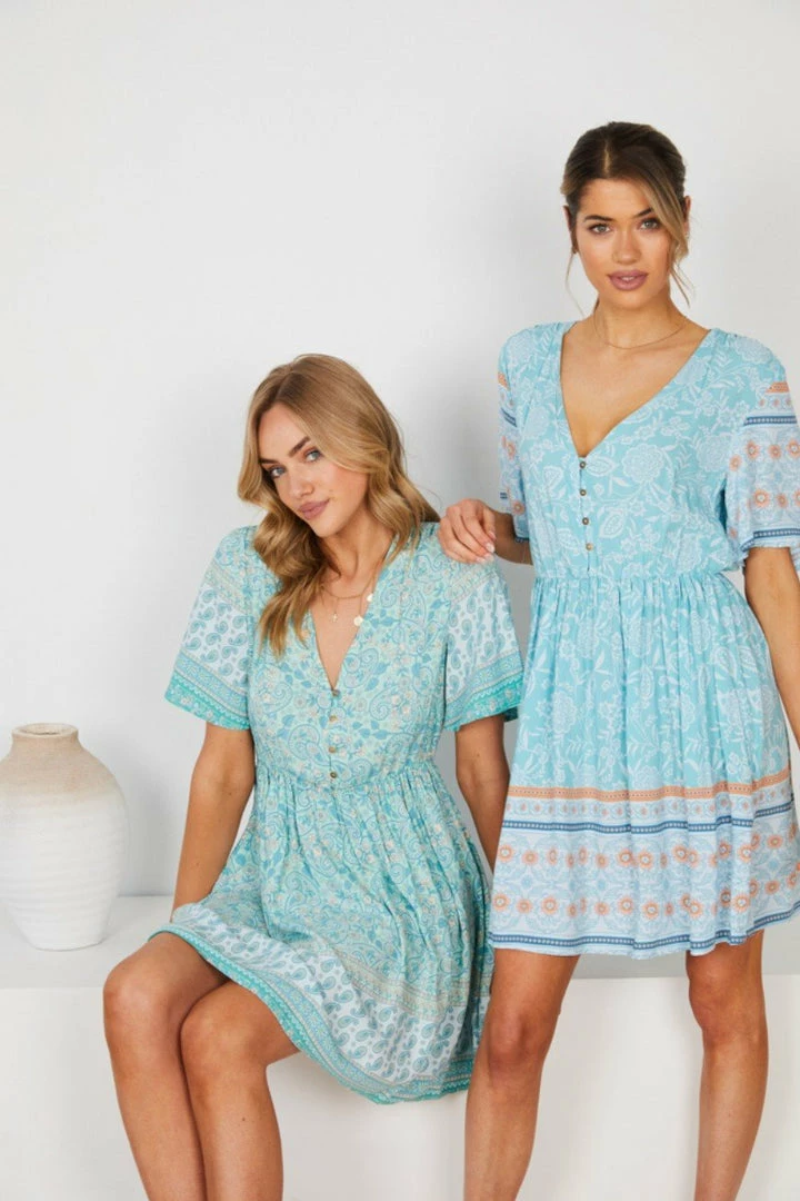 Our Ricarda Dress features a sage base with blue prints. It’s a gorgeous lightweight material ideal in a relaxed mini dress silhouette that is perfect for days spent in the sunshine. The V neckline is met with buttons making this ideal for breastfeeding. The short sleeves flutter out and are a feminine complementary feature to the gorgeously gathered waist detailing of the garment.