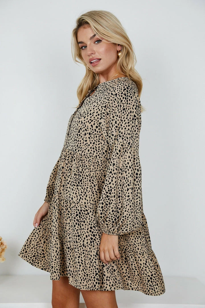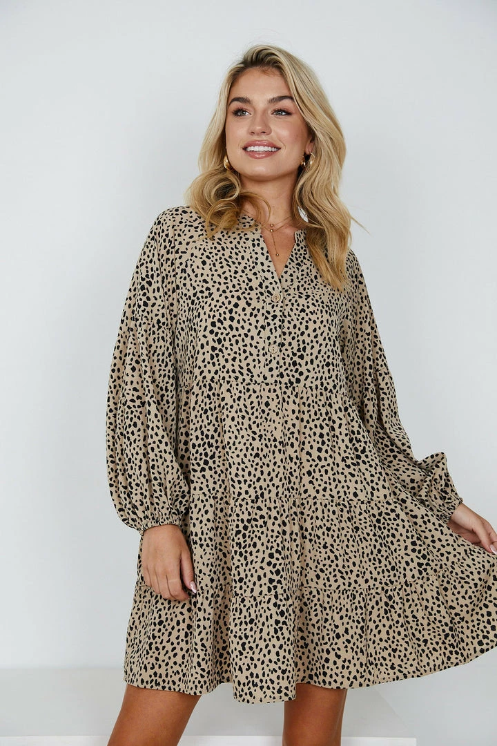 Our Sandoval Dress comes in a Leopard print. This dress features a v neckline, a tiered skirt, buttons down the front, and long cinched sleeves. Paired with a sunhat, this bright piece is perfect for brunch dates!